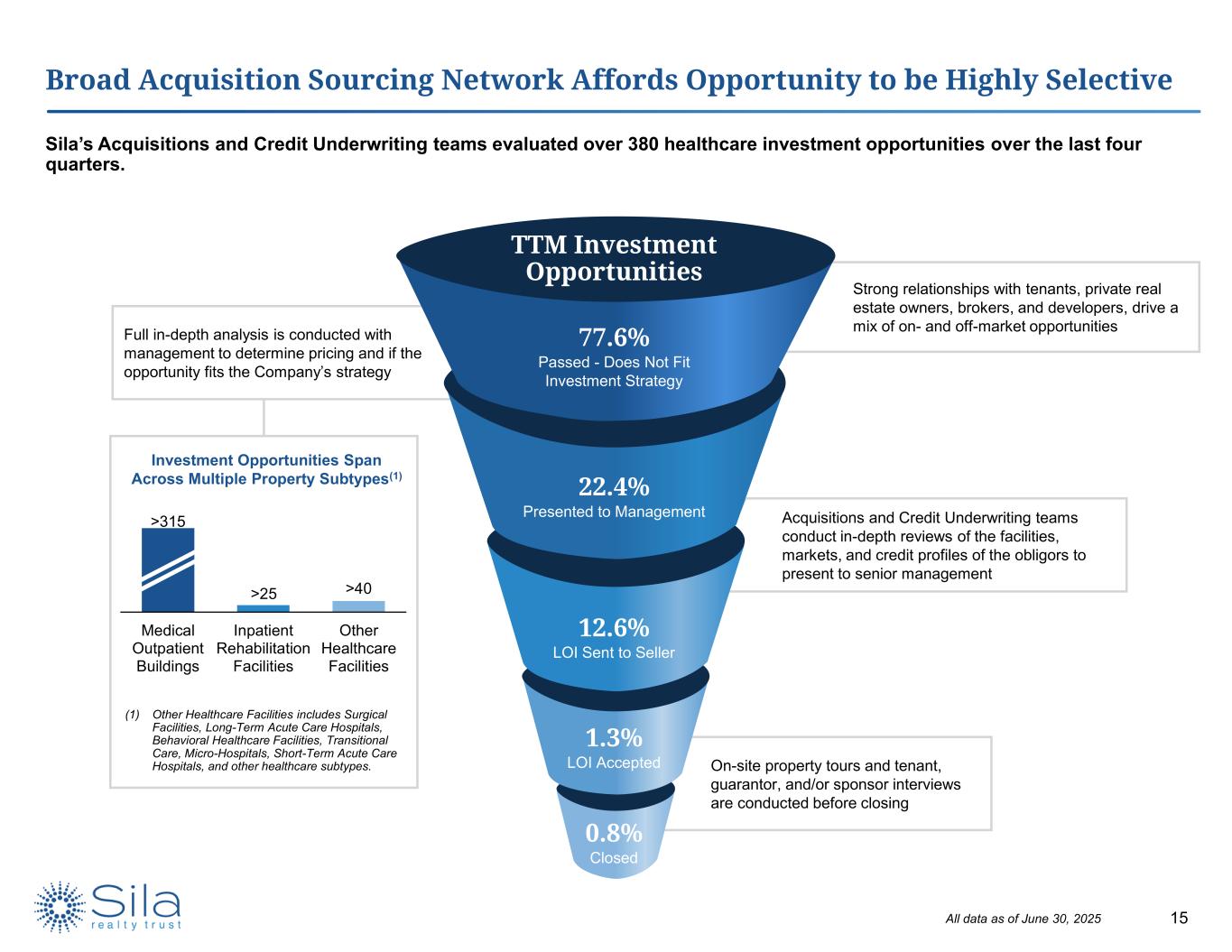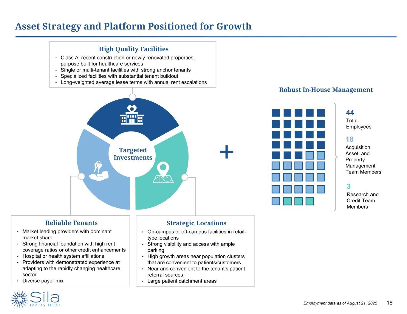 15 Broad Acquisition Sourcing Network Affords Opportunity to be Highly Selective On-site property tours and tenant, guarantor, and/or sponsor interviews are conducted before closing Strong relationships with tenants, private real estate owners, brokers, and developers, drive a mix of on- and off-market opportunities Full in-depth analysis is conducted with management to determine pricing and if the opportunity fits the Company’s strategy Acquisitions and Credit Underwriting teams conduct in-depth reviews of the facilities, markets, and credit profiles of the obligors to present to senior management Medical Outpatient Buildings Inpatient Rehabilitation Facilities Other Healthcare Facilities Investment Opportunities Span Across Multiple Property Subtypes(1) >315 >25 >40 (1) Other Healthcare Facilities includes Surgical Facilities, Long-Term Acute Care Hospitals, Behavioral Healthcare Facilities, Transitional Care, Micro-Hospitals, Short-Term Acute Care Hospitals, and other healthcare subtypes. 77.6% Passed - Does Not Fit Investment Strategy 22.4% Presented to Management 12.6% LOI Sent to Seller 1.3% LOI Accepted 0.8% Closed TTM Investment Opportunities Sila’s Acquisitions and Credit Underwriting teams evaluated over 380 healthcare investment opportunities over the last four quarters. All data as of June 30, 2025