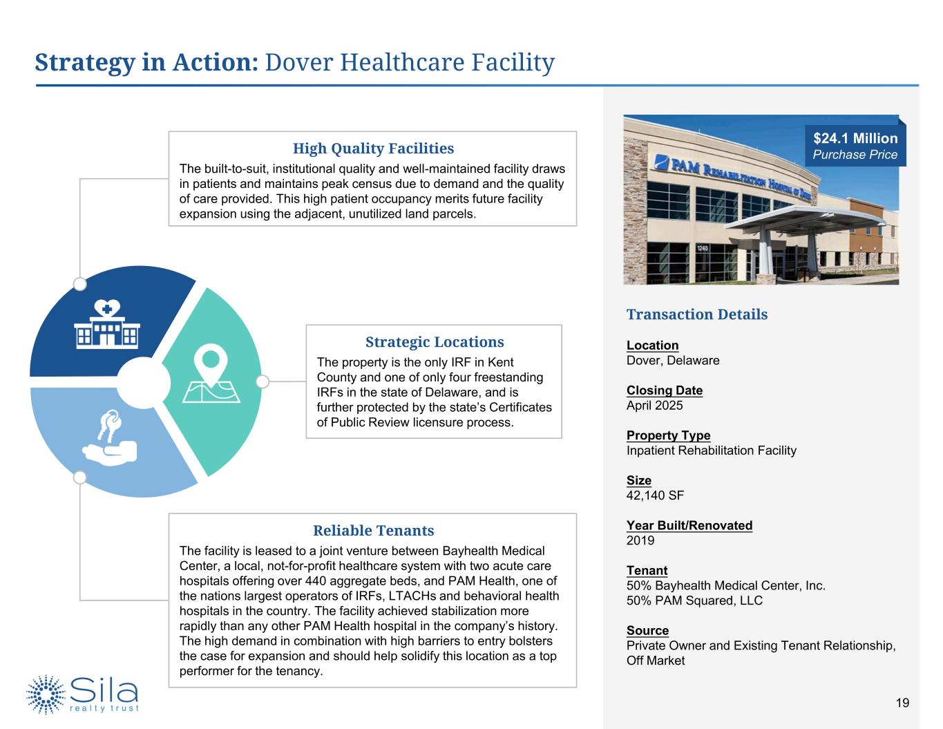 12 • Surgical Hospitals • While many routine surgeries have migrated to outpatient settings, inpatient surgical hospitals are indispensable for complex procedures such as cardiovascular surgeries, neurosurgeries, and multi-organ transplants. These high-acuity services necessitate advanced infrastructure, specialized staff, and comprehensive postoperative care that are typically available only in inpatient settings. • With a specialized staff who are more focused on a narrower set of procedures, surgical hospitals tend to have better patient outcomes, including lower costs and reduced mortality. Leading health systems continue to make substantial capital commitments to expand and modernize their inpatient surgical infrastructure, recognizing its strategic importance within the broader continuum of care. • Micro Hospitals • Micro-hospitals offer a scalable model for entering new markets without the capital intensity of full-scale acute care facilities. Their smaller footprint reduces risk and allows health systems to enhance geographic coverage cost-effectively. • These facilities enable providers to reinforce brand presence, increase market access, and build patient loyalty while keeping operating and development costs lower than traditional hospitals. • Long-Term Acute Care Hospitals (LTACHs) • With the large and growing number of U.S. adults with chronic conditions, LTACHs are uniquely equipped to manage those patients who may require extended hospital stays, specialized treatment plans, and multidisciplinary care teams. • Regulatory requirements and the need for specialized infrastructure form the moat that limits new market entrants, solidifying existing investments. • Behavioral Healthcare • There is vast pent-up demand and inefficiencies within the mental health services market. More than half of Americans cite affordability (52%) and lack of provider availability (42%) as key barriers to receiving behavioral healthcare. • Excess costs tied to overutilization and excess reliance on the emergency departments of hospital systems could lead to an increase burden on health systems limited capacity and leads to increases in wait times for other patients. The Case for Surgical & Specialty Facilities $53.9M ABR 31.6% ABR% 10.4 Yrs WALT $37.50 ABR / SF Sila Surgical & Specialty Facility Highlights Sources: National Institute of Health, American Hospital Association, Tampa General Hospital, William Blair, PracticeMatch,, Erdman, Crea United Data as of June 30, 2025 12