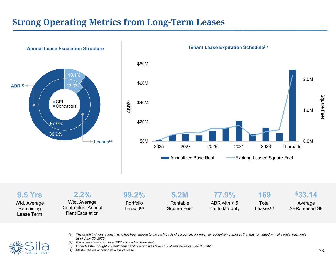 22 Diversified and Secure Tenancy Sila’s 136 operating healthcare properties are well-diversified through tenancy and across the continuum of care, reducing overexposure to any single healthcare subtype. Property Type Diversification(1) (ABR(2), Properties(4)) 36.4% 32.0% 31.6% Medical Outpatient Building Inpatient Rehabilitation Facility Surgical and Specialty Facilities 40.0% 27.9% 32.1% Investment Grade Rated Tenant/Guarantor or Affiliate Rated Tenant/Guarantor or Affiliate Non-Rated Tenant/Guarantor (1) Surgical and Specialty Facilities includes Surgical Facilities, Long-Term Acute Care Hospitals, Behavioral Healthcare Facilities, Transitional Care, Micro-Hospitals and Short-Term Acute Care Hospitals. (2) Based on annualized June 2025 contractual base rent. (3) All credit ratings from major credit rating agencies. Parent credit is used where tenant is not rated. (4) Excludes two undeveloped land parcels and one property taken out of service as of June 30, 2025. All data as of June 30, 2025. Tenant Credit Profile(2)(3) Single/Multi-Tenant Concentrations 89.7% 10.3% 91.0% 9.0% Single Tenant Multi-Tenant ABR(2) Properties(4) 88 26 22