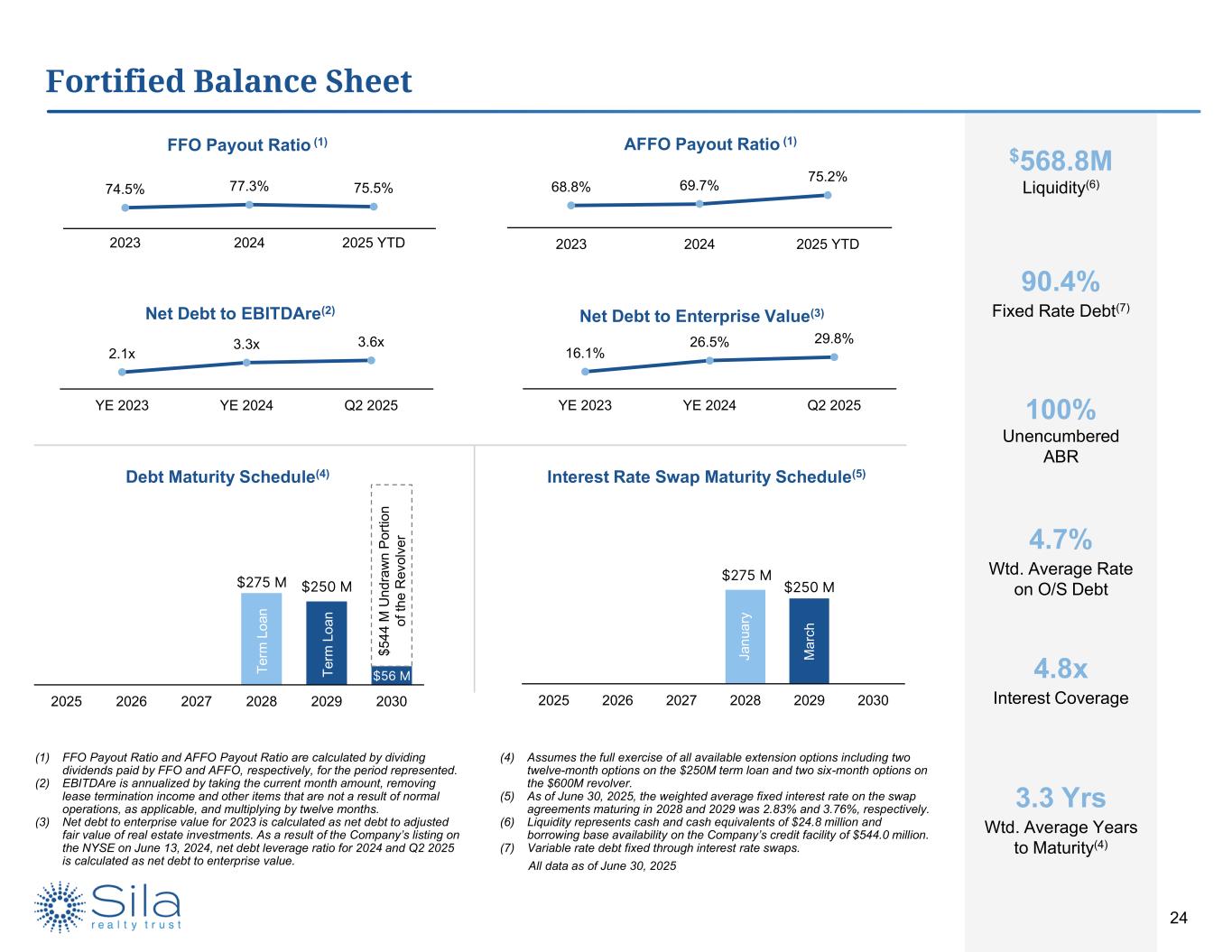 24 $275 M $250 M $56 M 2025 2026 2027 2028 2029 2030 $ 5 4 4 M U n d ra w n P o rt io n o f th e R e v o lv e r FFO Payout Ratio (1) 74.5% 77.3% 75.5% 2023 2024 2025 YTD 68.8% 69.7% 75.2% 2023 2024 2025 YTD Fortified Balance Sheet (1) FFO Payout Ratio and AFFO Payout Ratio are calculated by dividing dividends paid by FFO and AFFO, respectively, for the period represented. (2) EBITDAre is annualized by taking the current month amount, removing lease termination income and other items that are not a result of normal operations, as applicable, and multiplying by twelve months. (3) Net debt to enterprise value for 2023 is calculated as net debt to adjusted fair value of real estate investments. As a result of the Company’s listing on the NYSE on June 13, 2024, net debt leverage ratio for 2024 and Q2 2025 is calculated as net debt to enterprise value. (4) Assumes the full exercise of all available extension options including two twelve-month options on the $250M term loan and two six-month options on the $600M revolver. (5) As of June 30, 2025, the weighted average fixed interest rate on the swap agreements maturing in 2028 and 2029 was 2.83% and 3.76%, respectively. (6) Liquidity represents cash and cash equivalents of $24.8 million and borrowing base availability on the Company’s credit facility of $544.0 million. (7) Variable rate debt fixed through interest rate swaps. All data as of June 30, 2025 Debt Maturity Schedule(4) T e rm L o a n T e rm L o a n 2.1x 3.3x 3.6x YE 2023 YE 2024 Q2 2025 Net Debt to EBITDAre(2) 16.1% 26.5% 29.8% YE 2023 YE 2024 Q2 2025 Net Debt to Enterprise Value(3) $275 M $250 M 2025 2026 2027 2028 2029 2030 Interest Rate Swap Maturity Schedule(5) M a rc h J a n u a ry $568.8M Liquidity(6) 90.4% Fixed Rate Debt(7) 100% Unencumbered ABR 4.7% Wtd. Average Rate on O/S Debt 4.8x Interest Coverage 3.3 Yrs Wtd. Average Years to Maturity(4) AFFO Payout Ratio (1)