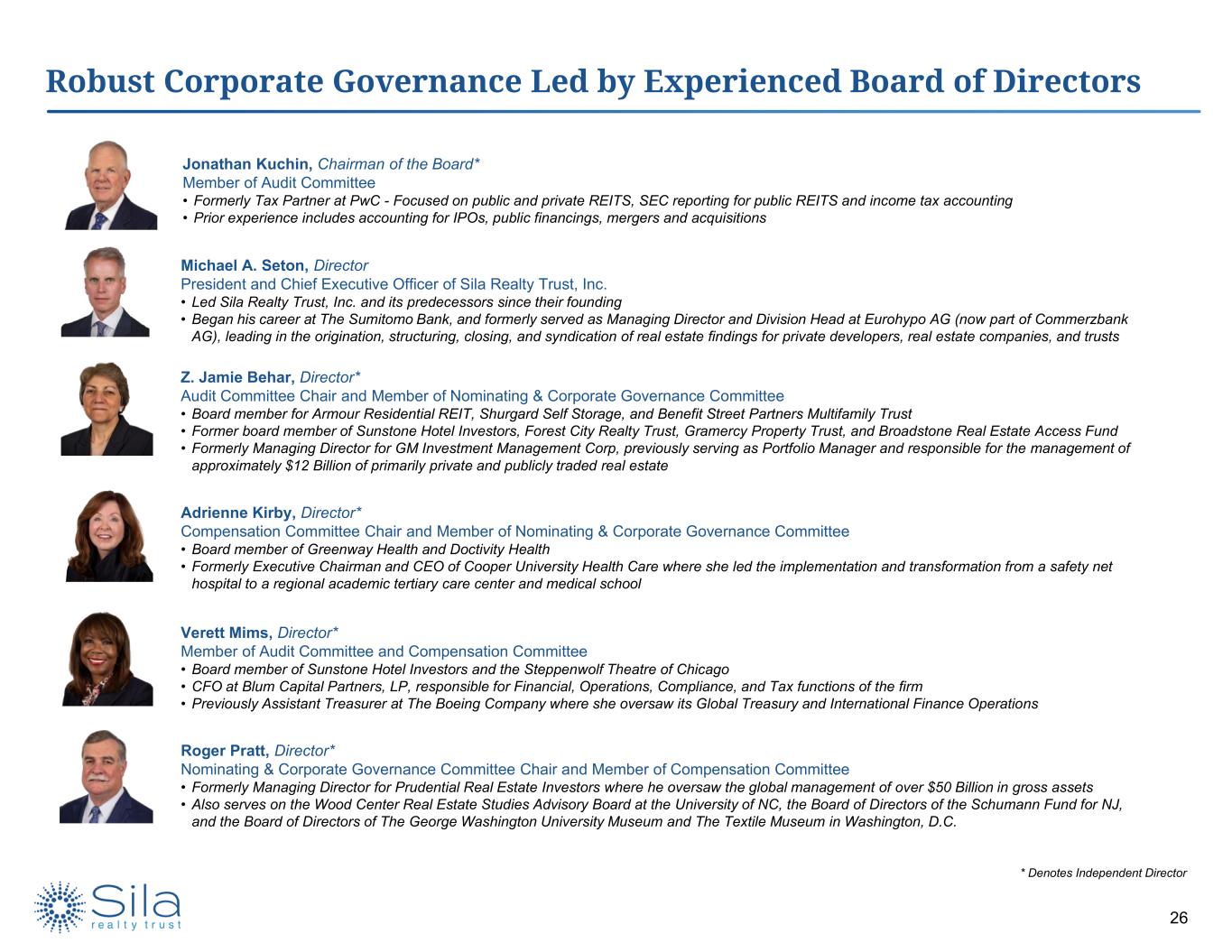 26 Robust Corporate Governance Led by Experienced Board of Directors * Denotes Independent Director Jonathan Kuchin, Chairman of the Board* Member of Audit Committee • Formerly Tax Partner at PwC - Focused on public and private REITS, SEC reporting for public REITS and income tax accounting • Prior experience includes accounting for IPOs, public financings, mergers and acquisitions Michael A. Seton, Director President and Chief Executive Officer of Sila Realty Trust, Inc. • Led Sila Realty Trust, Inc. and its predecessors since their founding • Began his career at The Sumitomo Bank, and formerly served as Managing Director and Division Head at Eurohypo AG (now part of Commerzbank AG), leading in the origination, structuring, closing, and syndication of real estate findings for private developers, real estate companies, and trusts Z. Jamie Behar, Director* Audit Committee Chair and Member of Nominating & Corporate Governance Committee • Board member for Armour Residential REIT, Shurgard Self Storage, and Benefit Street Partners Multifamily Trust • Former board member of Sunstone Hotel Investors, Forest City Realty Trust, Gramercy Property Trust, and Broadstone Real Estate Access Fund • Formerly Managing Director for GM Investment Management Corp, previously serving as Portfolio Manager and responsible for the management of approximately $12 Billion of primarily private and publicly traded real estate Adrienne Kirby, Director* Compensation Committee Chair and Member of Nominating & Corporate Governance Committee • Board member of Greenway Health and Doctivity Health • Formerly Executive Chairman and CEO of Cooper University Health Care where she led the implementation and transformation from a safety net hospital to a regional academic tertiary care center and medical school Verett Mims, Director* Member of Audit Committee and Compensation Committee • Board member of Sunstone Hotel Investors and the Steppenwolf Theatre of Chicago • CFO at Blum Capital Partners, LP, responsible for Financial, Operations, Compliance, and Tax functions of the firm • Previously Assistant Treasurer at The Boeing Company where she oversaw its Global Treasury and International Finance Operations Roger Pratt, Director* Nominating & Corporate Governance Committee Chair and Member of Compensation Committee • Formerly Managing Director for Prudential Real Estate Investors where he oversaw the global management of over $50 Billion in gross assets • Also serves on the Wood Center Real Estate Studies Advisory Board at the University of NC, the Board of Directors of the Schumann Fund for NJ, and the Board of Directors of The George Washington University Museum and The Textile Museum in Washington, D.C.
