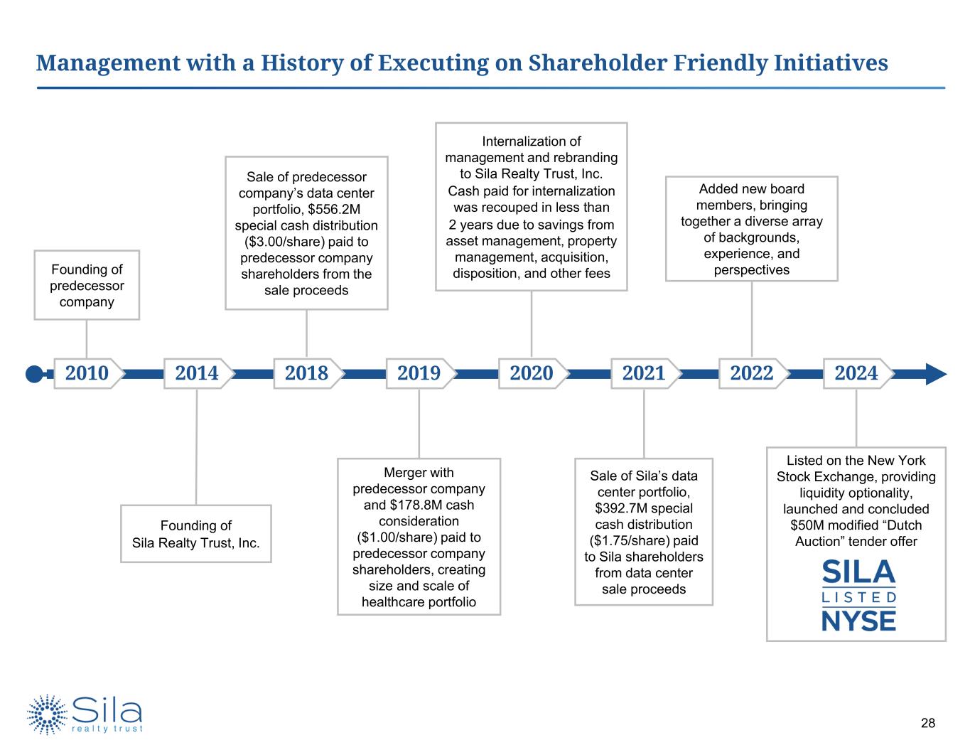 28 Management with a History of Executing on Shareholder Friendly Initiatives Founding of Sila Realty Trust, Inc. 2014 Sale of predecessor company’s data center portfolio, $556.2M special cash distribution ($3.00/share) paid to predecessor company shareholders from the sale proceeds 2018 Merger with predecessor company and $178.8M cash consideration ($1.00/share) paid to predecessor company shareholders, creating size and scale of healthcare portfolio 2019 Internalization of management and rebranding to Sila Realty Trust, Inc. Cash paid for internalization was recouped in less than 2 years due to savings from asset management, property management, acquisition, disposition, and other fees 2020 Sale of Sila’s data center portfolio, $392.7M special cash distribution ($1.75/share) paid to Sila shareholders from data center sale proceeds 2021 Added new board members, bringing together a diverse array of backgrounds, experience, and perspectives 2022 Listed on the New York Stock Exchange, providing liquidity optionality, launched and concluded $50M modified “Dutch Auction” tender offer 2024 Founding of predecessor company 2010