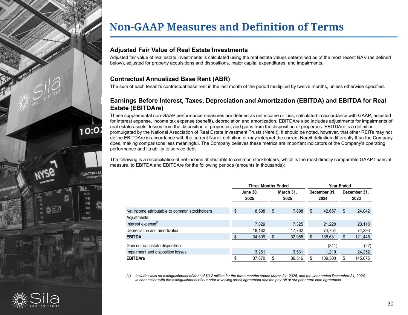 30 Non-GAAP Measures and Definition of Terms Adjusted Fair Value of Real Estate Investments Adjusted fair value of real estate investments is calculated using the real estate values determined as of the most recent NAV (as defined below), adjusted for property acquisitions and dispositions, major capital expenditures, and impairments. Contractual Annualized Base Rent (ABR) The sum of each tenant’s contractual base rent in the last month of the period multiplied by twelve months, unless otherwise specified. Earnings Before Interest, Taxes, Depreciation and Amortization (EBITDA) and EBITDA for Real Estate (EBITDAre) These supplemental non-GAAP performance measures are defined as net income or loss, calculated in accordance with GAAP, adjusted for interest expense, income tax expense (benefit), depreciation and amortization. EBITDAre also includes adjustments for impairments of real estate assets, losses from the disposition of properties, and gains from the disposition of properties. EBITDAre is a definition promulgated by the National Association of Real Estate Investment Trusts (Nareit). It should be noted, however, that other REITs may not define EBITDAre in accordance with the current Nareit definition or may interpret the current Nareit definition differently than the Company does, making comparisons less meaningful. The Company believes these metrics are important indicators of the Company’s operating performance and its ability to service debt. The following is a reconciliation of net income attributable to common stockholders, which is the most directly comparable GAAP financial measure, to EBITDA and EBITDAre for the following periods (amounts in thousands): June 30, March 31, December 31, December 31, 2025 2025 2024 2023 Net income attributable to common stockholders 8,598$ 7,898$ 42,657$ 24,042$ Adjustments: Interest expense (1) 7,829 7,325 21,220 23,110 Depreciation and amortization 18,182 17,762 74,754 74,293 EBITDA 34,609$ 32,985$ 138,631$ 121,445$ Gain on real estate dispositions - - (341) (22) Impairment and disposition losses 3,261 3,531 1,210 24,252 EBITDAre 37,870$ 36,516$ 139,500$ 145,675$ Year EndedThree Months Ended (1) Includes loss on extinguishment of debt of $0.2 million for the three months ended March 31, 2025, and the year ended December 31, 2024, in connection with the extinguishment of our prior revolving credit agreement and the pay-off of our prior term loan agreement.