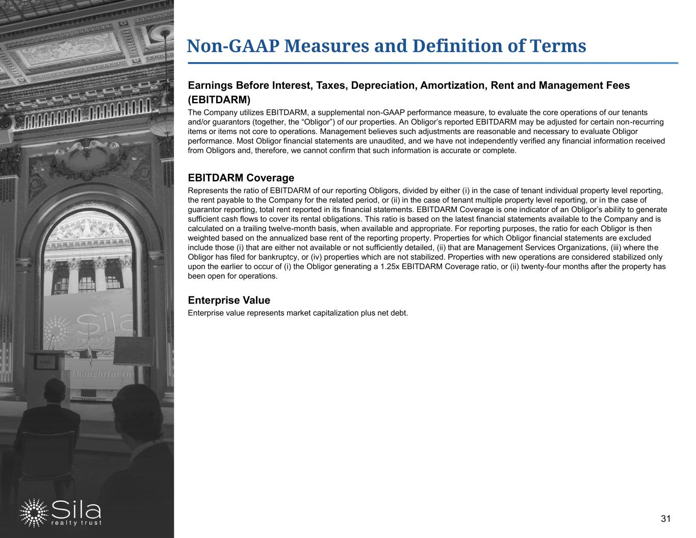 31 Non-GAAP Measures and Definition of Terms Earnings Before Interest, Taxes, Depreciation, Amortization, Rent and Management Fees (EBITDARM) The Company utilizes EBITDARM, a supplemental non-GAAP performance measure, to evaluate the core operations of our tenants and/or guarantors (together, the “Obligor”) of our properties. An Obligor’s reported EBITDARM may be adjusted for certain non-recurring items or items not core to operations. Management believes such adjustments are reasonable and necessary to evaluate Obligor performance. Most Obligor financial statements are unaudited, and we have not independently verified any financial information received from Obligors and, therefore, we cannot confirm that such information is accurate or complete. EBITDARM Coverage Represents the ratio of EBITDARM of our reporting Obligors, divided by either (i) in the case of tenant individual property level reporting, the rent payable to the Company for the related period, or (ii) in the case of tenant multiple property level reporting, or in the case of guarantor reporting, total rent reported in its financial statements. EBITDARM Coverage is one indicator of an Obligor’s ability to generate sufficient cash flows to cover its rental obligations. This ratio is based on the latest financial statements available to the Company and is calculated on a trailing twelve-month basis, when available and appropriate. For reporting purposes, the ratio for each Obligor is then weighted based on the annualized base rent of the reporting property. Properties for which Obligor financial statements are excluded include those (i) that are either not available or not sufficiently detailed, (ii) that are Management Services Organizations, (iii) where the Obligor has filed for bankruptcy, or (iv) properties which are not stabilized. Properties with new operations are considered stabilized only upon the earlier to occur of (i) the Obligor generating a 1.25x EBITDARM Coverage ratio, or (ii) twenty-four months after the property has been open for operations. Enterprise Value Enterprise value represents market capitalization plus net debt.