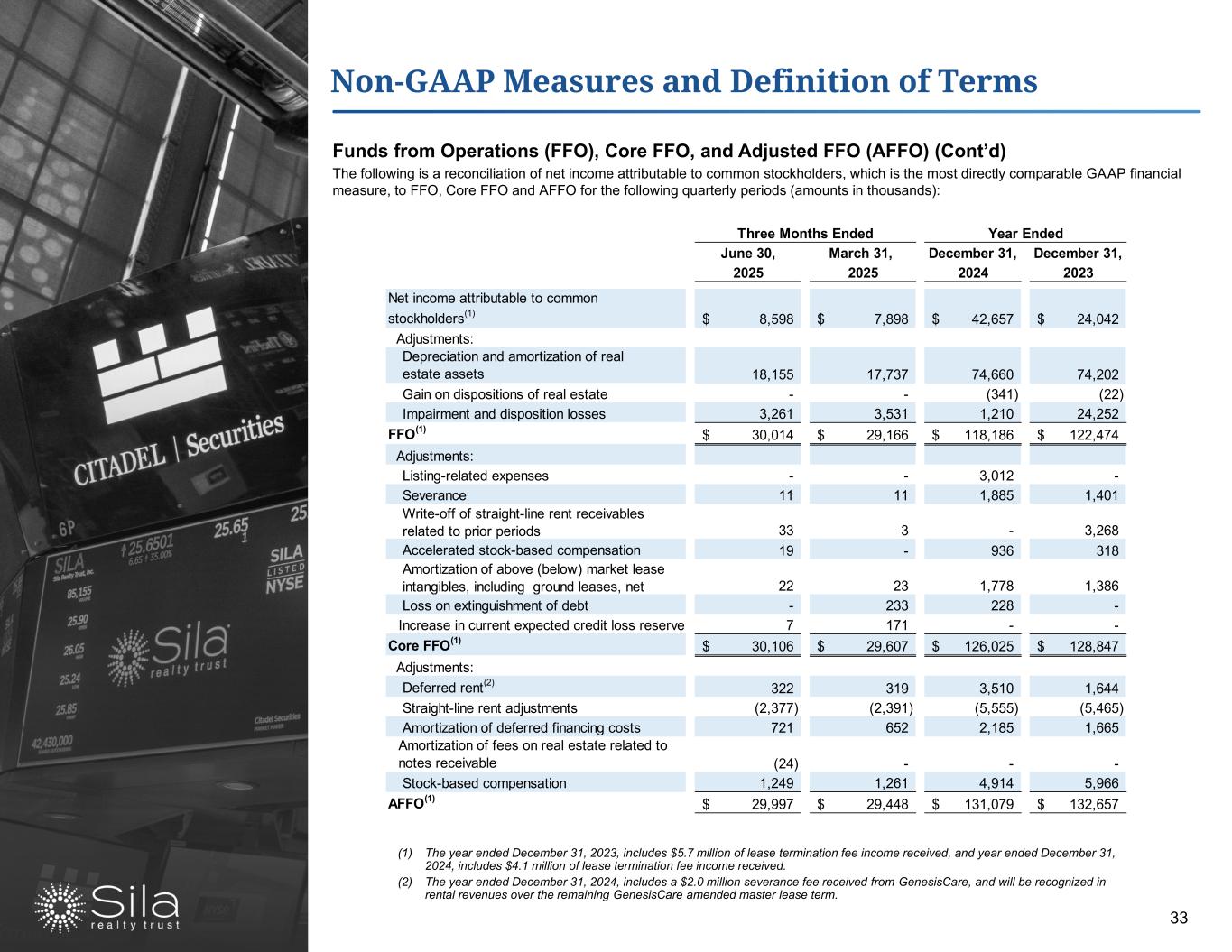 32 Non-GAAP Measures and Definition of Terms Funds from Operations (FFO), Core FFO, and Adjusted FFO (AFFO) FFO, a non-GAAP financial measure, is calculated consistent with Nareit’s definition, as net income (calculated in accordance with GAAP), excluding gains and losses from sales of real estate assets, impairment of real estate assets and investments in entities when the impairment is directly attributable to decreases in the value of depreciable real estate held by the entity, and depreciation and amortization of real estate assets. Adjustments for unconsolidated partnerships and joint ventures will be calculated to reflect FFO on the same basis. The Company does not have any investments in unconsolidated partnerships or joint ventures. The Company believes FFO provides a useful understanding of our performance to investors and to our management, and when compared to year over year, FFO reflects the impact on our operations from trends in occupancy. It should be noted, however, that other REITs may not define FFO in accordance with the current Nareit definition or may interpret the current Nareit definition differently than the Company does, making comparisons less meaningful. The Company believes Core FFO, a non-GAAP financial measure, is a supplemental financial performance measure that provides investors with additional information to understand the Company's sustainable performance. The Company calculates Core FFO by adjusting FFO to remove the effect of certain GAAP non-cash income and expense items, unusual and infrequent items that are not expected to impact its operating performance on an ongoing basis, items that affect comparability to prior periods and/or items that are not related to its core real estate operations. Excluded items include listing-related expenses, severance, write-off of straight-line rent receivables related to prior periods, accelerated stock-based compensation, amortization of above- and below-market lease intangibles (including ground leases), loss on extinguishment of debt and changes in current expected credit loss reserve. Other REITs may use different methodologies for calculating Core FFO and, accordingly, the Company’s Core FFO may not be comparable to other REITs. The Company believes AFFO, a non-GAAP financial measure, is a supplemental financial performance measure that provides investors appropriate supplemental information to evaluate the ongoing operations of the Company. AFFO is a metric used by management to evaluate the Company's dividend policy. The Company calculates AFFO by further adjusting Core FFO for the following items: deferred rent, current period straight-line rent adjustments, amortization of deferred financing costs, amortization of fees on our real estate related notes receivable and stock-based compensation. Other REITs may use different methodologies for calculating AFFO and, accordingly, the Company’s AFFO may not be comparable to other REITs. FFO, Core FFO and AFFO should not be considered to be more relevant or accurate than the GAAP methodology in calculating net income or in its applicability in evaluating the Company's operational performance. The method used to evaluate the value and performance of real estate under GAAP should be considered a more relevant measure of operating performance and more prominent than the non-GAAP FFO, Core FFO and AFFO measures and the adjustments to GAAP in calculating FFO, Core FFO and AFFO.