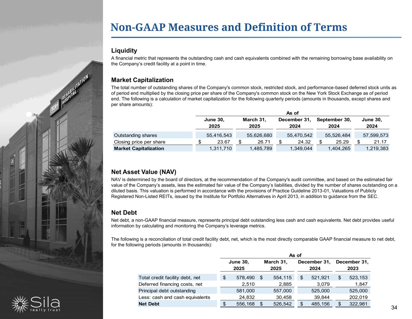 34 Non-GAAP Measures and Definition of Terms Liquidity A financial metric that represents the outstanding cash and cash equivalents combined with the remaining borrowing base availability on the Company’s credit facility at a point in time. Market Capitalization The total number of outstanding shares of the Company's common stock, restricted stock, and performance-based deferred stock units as of period end multiplied by the closing price per share of the Company's common stock on the New York Stock Exchange as of period end. The following is a calculation of market capitalization for the following quarterly periods (amounts in thousands, except shares and per share amounts): Net Asset Value (NAV) NAV is determined by the board of directors, at the recommendation of the Company's audit committee, and based on the estimated fair value of the Company’s assets, less the estimated fair value of the Company’s liabilities, divided by the number of shares outstanding on a diluted basis. This valuation is performed in accordance with the provisions of Practice Guideline 2013-01, Valuations of Publicly Registered Non-Listed REITs, issued by the Institute for Portfolio Alternatives in April 2013, in addition to guidance from the SEC. Net Debt Net debt, a non-GAAP financial measure, represents principal debt outstanding less cash and cash equivalents. Net debt provides useful information by calculating and monitoring the Company’s leverage metrics. The following is a reconciliation of total credit facility debt, net, which is the most directly comparable GAAP financial measure to net debt, for the following periods (amounts in thousands): June 30, March 31, December 31, December 31, 2025 2025 2024 2023 Total credit facility debt, net 578,490$ 554,115$ 521,921$ 523,153$ Deferred financing costs, net 2,510 2,885 3,079 1,847 Principal debt outstanding 581,000 557,000 525,000 525,000 Less: cash and cash equivalents 24,832 30,458 39,844 202,019 Net Debt 556,168$ 526,542$ 485,156$ 322,981$ As of June 30, March 31, December 31, September 30, June 30, 2025 2025 2024 2024 2024 Outstanding shares 55,416,543 55,626,680 55,470,542 55,526,484 57,599,573 Closing price per share 23.67$ 26.71$ 24.32$ 25.29$ 21.17$ Market Capitalization 1,311,710 1,485,789 1,349,044 1,404,265 1,219,383 As of