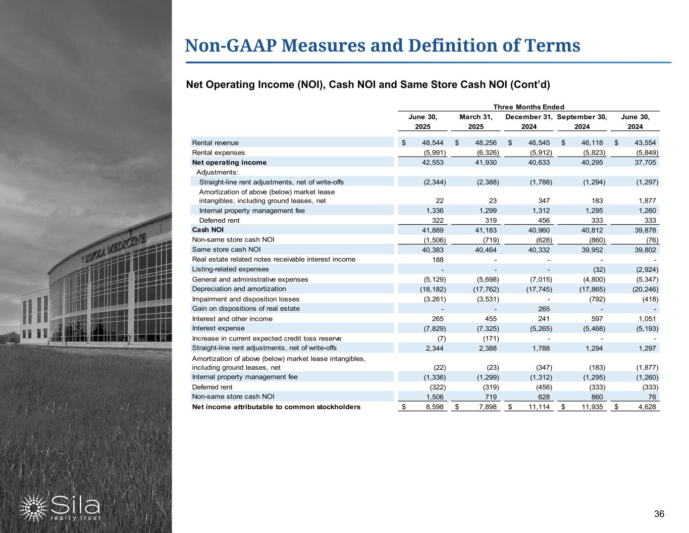 35 Non-GAAP Measures and Definition of Terms Net Operating Income (NOI), Cash NOI and Same Store Cash NOI NOI, a non-GAAP financial measure, is defined as rental revenue, less rental expenses, on an accrual basis. Cash NOI is calculated to exclude the impact of GAAP adjustments to rental revenue and rental expenses, consisting of straight-line rent adjustments, net of write- offs, amortization of above- and below-market lease intangibles (including ground leases), and internal property management fees, then including deferred rent received in cash, and is used to evaluate the cash-based performance of the Company’s real estate portfolio. Same store Cash NOI is calculated to exclude non-same store cash NOI. The Company believes that NOI and Cash NOI both serve as useful supplements to net income because they allow investors and management to measure unlevered property-level operating results and to compare these results to the comparable results of other real estate companies on a consistent basis. The Company uses both NOI and Cash NOI to make decisions about resource allocations and to assess the property-level performance of the real estate portfolio. As an indicator of financial performance, neither metric should be considered as an alternative to net income, determined in accordance with GAAP. The Company believes that in order to facilitate a clear understanding of the consolidated historical operating results, both metrics should be evaluated in conjunction with net income as presented in the consolidated financial statements included on the Company’s Annual Report on Form 10-K filed with the SEC on March 3, 2025. The following is a reconciliation from net income attributable to common stockholders, which is the most directly comparable GAAP financial measure, to NOI, Cash NOI and Same Store Cash NOI, for the following periods (amounts in thousands):