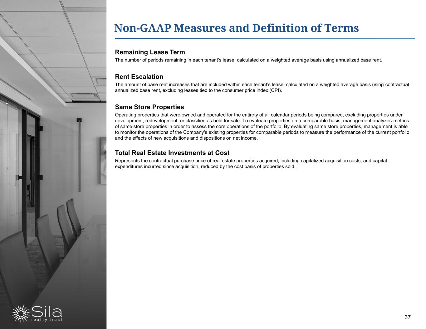 36 Non-GAAP Measures and Definition of Terms Net Operating Income (NOI), Cash NOI and Same Store Cash NOI (Cont’d) June 30, March 31, December 31, September 30, June 30, 2025 2025 2024 2024 2024 Rental revenue 48,544$ 48,256$ 46,545$ 46,118$ 43,554$ Rental expenses (5,991) (6,326) (5,912) (5,823) (5,849) Net operating income 42,553 41,930 40,633 40,295 37,705 Adjustments: Straight-line rent adjustments, net of write-offs (2,344) (2,388) (1,788) (1,294) (1,297) Amortization of above (below) market lease intangibles, including ground leases, net 22 23 347 183 1,877 Internal property management fee 1,336 1,299 1,312 1,295 1,260 Deferred rent 322 319 456 333 333 Cash NOI 41,889 41,183 40,960 40,812 39,878 Non-same store cash NOI (1,506) (719) (628) (860) (76) Same store cash NOI 40,383 40,464 40,332 39,952 39,802 Real estate related notes receivable interest income 188 - - - - Listing-related expenses - - - (32) (2,924) General and administrative expenses (5,129) (5,698) (7,015) (4,800) (5,347) Depreciation and amortization (18,182) (17,762) (17,745) (17,865) (20,246) Impairment and disposition losses (3,261) (3,531) - (792) (418) Gain on dispositions of real estate - - 265 - - Interest and other income 265 455 241 597 1,051 Interest expense (7,829) (7,325) (5,265) (5,468) (5,193) Increase in current expected credit loss reserve (7) (171) - - - Straight-line rent adjustments, net of write-offs 2,344 2,388 1,788 1,294 1,297 Amortization of above (below) market lease intangibles, including ground leases, net (22) (23) (347) (183) (1,877) Internal property management fee (1,336) (1,299) (1,312) (1,295) (1,260) Deferred rent (322) (319) (456) (333) (333) Non-same store cash NOI 1,506 719 628 860 76 Net income attributable to common stockholders 8,598$ 7,898$ 11,114$ 11,935$ 4,628$ Three Months Ended