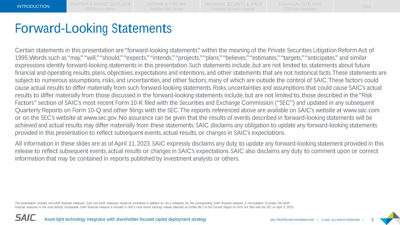 3SAIC PROPRIETARY INFORMATION I © SAIC. ALL RIGHTS RESERVED IAsset-light technology integrator with shareholder-focused capital deployment strategy Certain statements in this presentation are “forward-looking statements” within the meaning of the Private Securities Litigation Reform Act of 1995. Words such as “may,” “will,” “should,” “expects,” “intends,” “projects,” “plans,” “believes,” “estimates,” “targets,” “anticipates,” and similar expressions identify forward-looking statements in this presentation. Such statements include, but are not limited to, statements about future financial and operating results, plans, objectives, expectations and intentions, and other statements that are not historical facts. These statements are subject to numerous assumptions, risks, and uncertainties, and other factors, many of which are outside the control of SAIC. These factors could cause actual results to differ materially from such forward-looking statements. Risks, uncertainties and assumptions that could cause SAIC’s actual results to differ materially from those discussed in the forward-looking statements include, but are not limited to, those described in the “Risk Factors” section of SAIC’s most recent Form 10-K filed with the Securities and Exchange Commission (“SEC”) and updated in any subsequent Quarterly Reports on Form 10-Q and other filings with the SEC. The reports referenced above are available on SAIC’s website at www.saic.com or on the SEC’s website at www.sec.gov. No assurance can be given that the results of events described in forward-looking statements will be achieved and actual results may differ materially from these statements. SAIC disclaims any obligation to update any forward-looking statements provided in this presentation to reflect subsequent events, actual results, or changes in SAIC’s expectations. All information in these slides are as of April 11, 2023. SAIC expressly disclaims any duty to update any forward-looking statement provided in this release to reflect subsequent events, actual results or changes in SAIC’s expectations. SAIC also disclaims any duty to comment upon or correct information that may be contained in reports published by investment analysts or others. Forward-Looking Statements INTRODUCTION STRATEGY & MARKET OUTLOOK CEO Nazzic Keene DEFENSE & CIVILIAN President Bob Genter NATIONAL SECURITY & SPACE President Michael LaRouche FINANCIAL OUTLOOK CFO Prabu Natarajan Q&A This presentation includes non-GAAP financial measures. Such non-GAAP measures should be considered in addition to, not a substitute for, the corresponding GAAP financial measure. A reconciliation of certain non-GAAP financial measures to the most directly comparable GAAP financial measure is included in SAIC's most recent earnings release attached as Exhibit 99.1 to the Current Report on Form 8-K filed with the SEC on April 3, 2023.