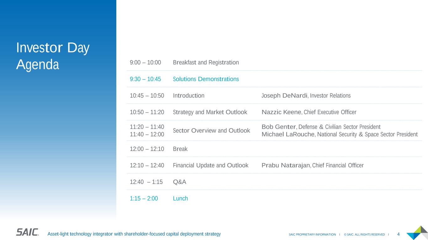 4SAIC PROPRIETARY INFORMATION I © SAIC. ALL RIGHTS RESERVED IAsset-light technology integrator with shareholder-focused capital deployment strategy Investor Day Agenda 9:00 – 10:00 Breakfast and Registration 9:30 – 10:45 Solutions Demonstrations 10:45 – 10:50 Introduction Joseph DeNardi, Investor Relations 10:50 – 11:20 Strategy and Market Outlook Nazzic Keene, Chief Executive Officer 11:20 – 11:40 11:40 – 12:00 Sector Overview and Outlook Bob Genter, Defense & Civilian Sector President Michael LaRouche, National Security & Space Sector President 12:00 – 12:10 Break 12:10 – 12:40 Financial Update and Outlook Prabu Natarajan, Chief Financial Officer 12:40 – 1:15 Q&A 1:15 – 2:00 Lunch