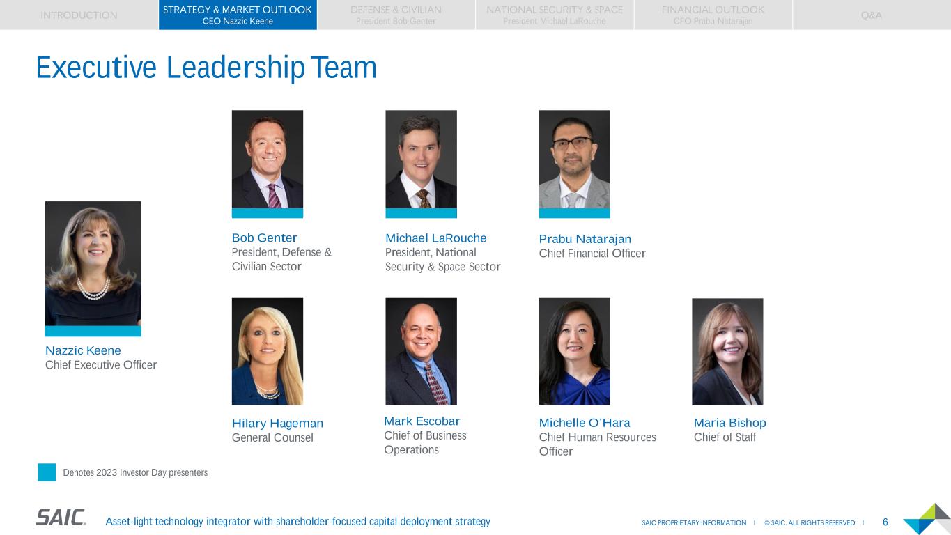 6SAIC PROPRIETARY INFORMATION I © SAIC. ALL RIGHTS RESERVED IAsset-light technology integrator with shareholder-focused capital deployment strategy Executive Leadership Team Denotes 2023 Investor Day presenters Nazzic Keene Chief Executive Officer Maria Bishop Chief of Staff Mark Escobar Chief of Business Operations Hilary Hageman General Counsel Michelle O’Hara Chief Human Resources Officer Bob Genter President, Defense & Civilian Sector Michael LaRouche President, National Security & Space Sector Prabu Natarajan Chief Financial Officer INTRODUCTION STRATEGY & MARKET OUTLOOK CEO Nazzic Keene DEFENSE & CIVILIAN President Bob Genter NATIONAL SECURITY & SPACE President Michael LaRouche FINANCIAL OUTLOOK CFO Prabu Natarajan Q&A
