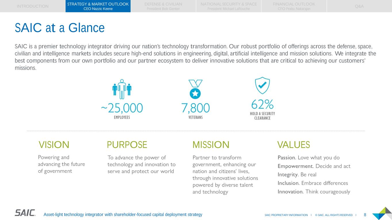 7SAIC PROPRIETARY INFORMATION I © SAIC. ALL RIGHTS RESERVED IAsset-light technology integrator with shareholder-focused capital deployment strategy SAIC Fiscal Year 2026 Targets REVENUE $7.3B – $7.5B 2% to 4% organic revenue growth CAGR FREE CASH FLOW* $515M ~$11/share EBITDA* $700M – $725M FY26 adj. EBITDA* margin guidance of 9.5%-9.7% GTA (Growth and Technology Accelerants) ~40% of Revenue INTRODUCTION STRATEGY & MARKET OUTLOOK CEO Nazzic Keene DEFENSE & CIVILIAN President Bob Genter NATIONAL SECURITY & SPACE President Michael LaRouche FINANCIAL OUTLOOK CFO Prabu Natarajan Q&A * A non-GAAP financial measure. Such non-GAAP measure should be considered in addition to, not a substitute for, the corresponding GAAP financial measure