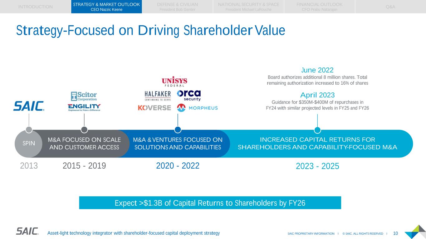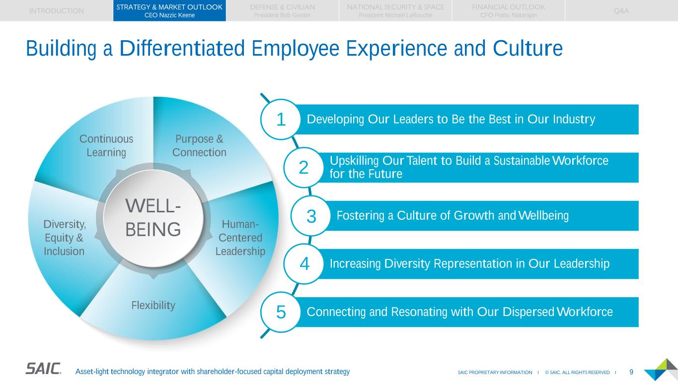 9SAIC PROPRIETARY INFORMATION I © SAIC. ALL RIGHTS RESERVED IAsset-light technology integrator with shareholder-focused capital deployment strategy Building a Differentiated Employee Experience and Culture INTRODUCTION STRATEGY & MARKET OUTLOOK CEO Nazzic Keene DEFENSE & CIVILIAN President Bob Genter NATIONAL SECURITY & SPACE President Michael LaRouche FINANCIAL OUTLOOK CFO Prabu Natarajan Q&A Developing Our Leaders to Be the Best in Our Industry Upskilling Our Talent to Build a Sustainable Workforce for the Future Fostering a Culture of Growth and Wellbeing Increasing Diversity Representation in Our Leadership Connecting and Resonating with Our Dispersed Workforce 2 1 3 4 5Flexibility Diversity, Equity & Inclusion Human- Centered Leadership Continuous Learning Purpose & Connection WELL- BEING