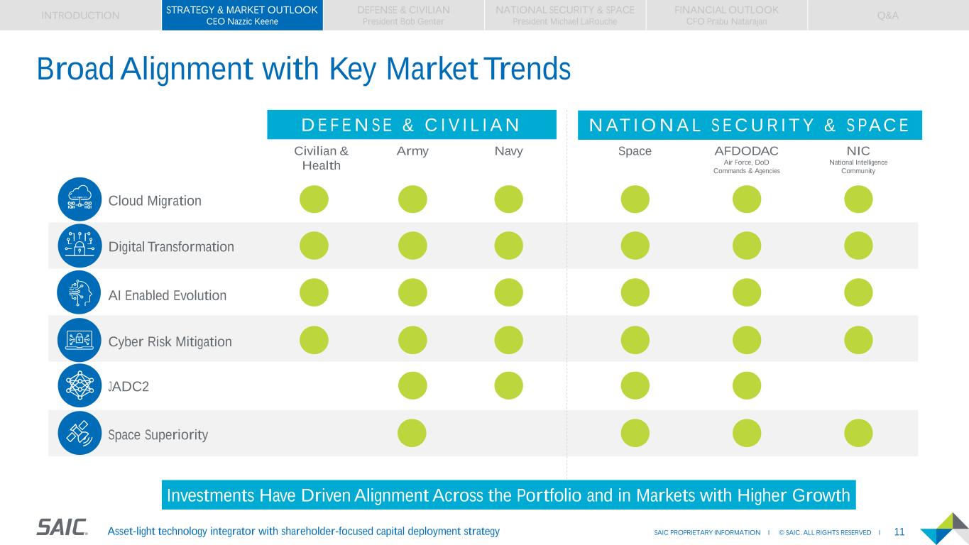 10SAIC PROPRIETARY INFORMATION I © SAIC. ALL RIGHTS RESERVED IAsset-light technology integrator with shareholder-focused capital deployment strategy Strategy-Focused on Driving Shareholder Value SPIN M&A FOCUSED ON SCALE AND CUSTOMER ACCESS M&A & VENTURES FOCUSED ON SOLUTIONS AND CAPABILITIES INCREASED CAPITAL RETURNS FOR SHAREHOLDERS AND CAPABILITY-FOCUSED M&A June 2022 Board authorizes additional 8 million shares. Total remaining authorization increased to 16% of shares April 2023 Guidance for $350M-$400M of repurchases in FY24 with similar projected levels in FY25 and FY26 2023 - 20252020 - 20222015 - 20192013 INTRODUCTION STRATEGY & MARKET OUTLOOK CEO Nazzic Keene DEFENSE & CIVILIAN President Bob Genter NATIONAL SECURITY & SPACE President Michael LaRouche FINANCIAL OUTLOOK CFO Prabu Natarajan Q&A Expect >$1.3B of Capital Returns to Shareholders by FY26
