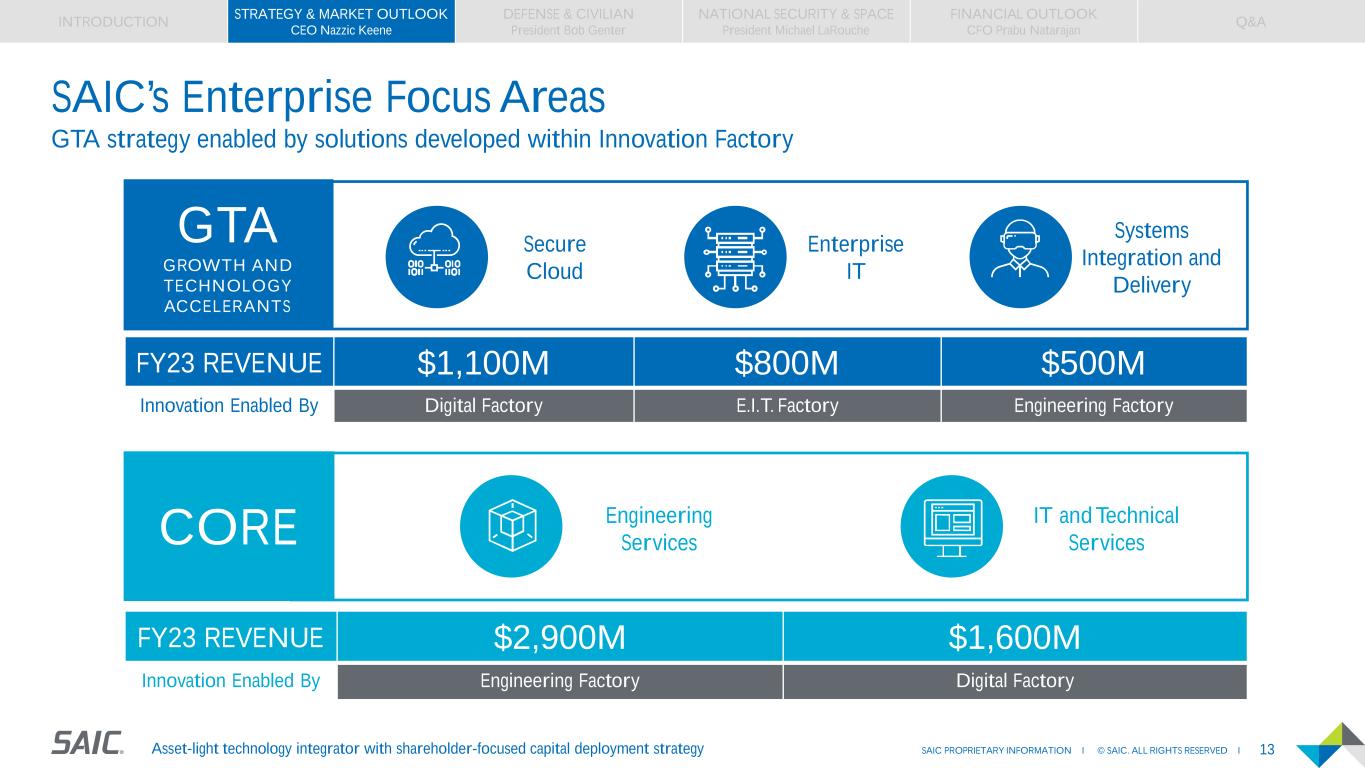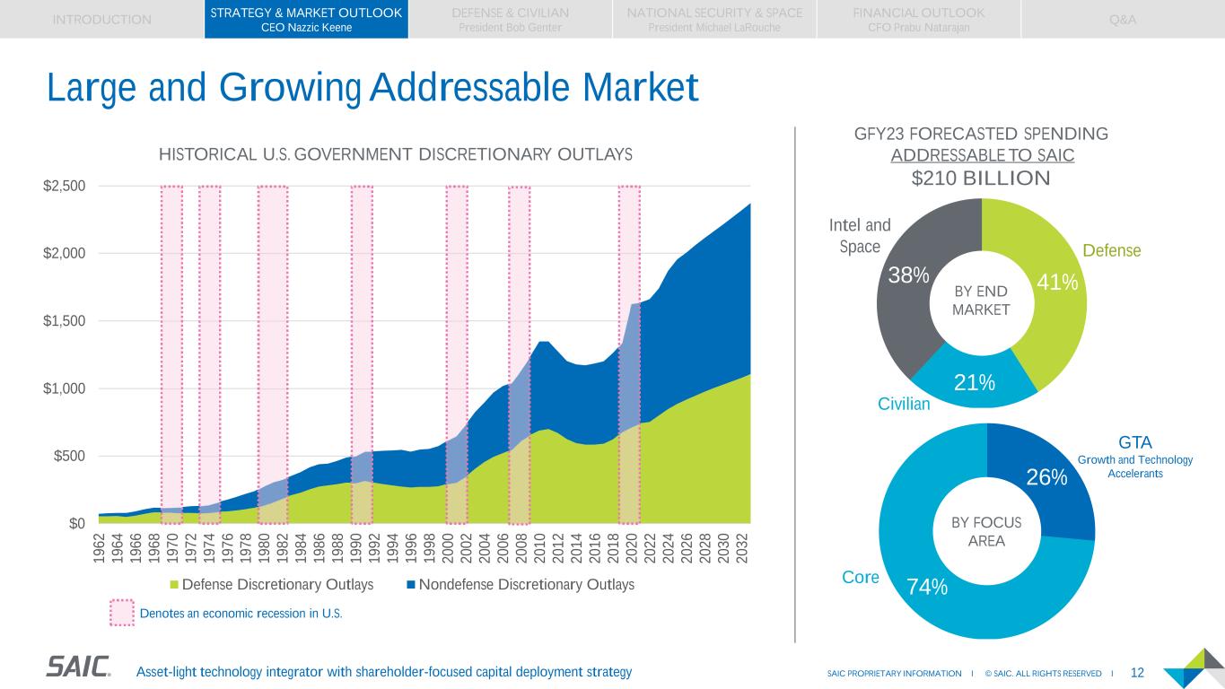 12SAIC PROPRIETARY INFORMATION I © SAIC. ALL RIGHTS RESERVED IAsset-light technology integrator with shareholder-focused capital deployment strategy INTRODUCTION STRATEGY & MARKET OUTLOOK CEO Nazzic Keene DEFENSE & CIVILIAN President Bob Genter NATIONAL SECURITY & SPACE President Michael LaRouche FINANCIAL OUTLOOK CFO Prabu Natarajan Q&A Large and Growing Addressable Market 41% 21% 38% GFY23 FORECASTED SPENDING ADDRESSABLE TO SAIC $210 BILLION Defense Civilian Intel and Space BY END MARKET 26% 74% GTA Growth and Technology Accelerants Core $0 $500 $1,000 $1,500 $2,000 $2,500 19 62 19 64 19 66 19 68 19 70 19 72 19 74 19 76 19 78 19 80 19 82 19 84 19 86 19 88 19 90 19 92 19 94 19 96 19 98 20 00 20 02 20 04 20 06 20 08 20 10 20 12 20 14 20 16 20 18 20 20 20 22 20 24 20 26 20 28 20 30 20 32 Defense Discretionary Outlays Nondefense Discretionary Outlays BY FOCUS AREA Denotes an economic recession in U.S. HISTORICAL U.S. GOVERNMENT DISCRETIONARY OUTLAYS