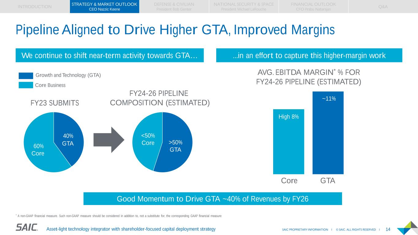 13SAIC PROPRIETARY INFORMATION I © SAIC. ALL RIGHTS RESERVED IAsset-light technology integrator with shareholder-focused capital deployment strategy SAIC’s Enterprise Focus Areas GTA strategy enabled by solutions developed within Innovation Factory GTA GROWTH AND TECHNOLOGY ACCELERANTS Secure Cloud Enterprise IT Systems Integration and Delivery CORE IT and Technical Services Engineering Services FY23 REVENUE $1,100M $800M $500M Innovation Enabled By Digital Factory E.I.T. Factory Engineering Factory FY23 REVENUE $2,900M $1,600M Innovation Enabled By Engineering Factory Digital Factory INTRODUCTION STRATEGY & MARKET OUTLOOK CEO Nazzic Keene DEFENSE & CIVILIAN President Bob Genter NATIONAL SECURITY & SPACE President Michael LaRouche FINANCIAL OUTLOOK CFO Prabu Natarajan Q&A