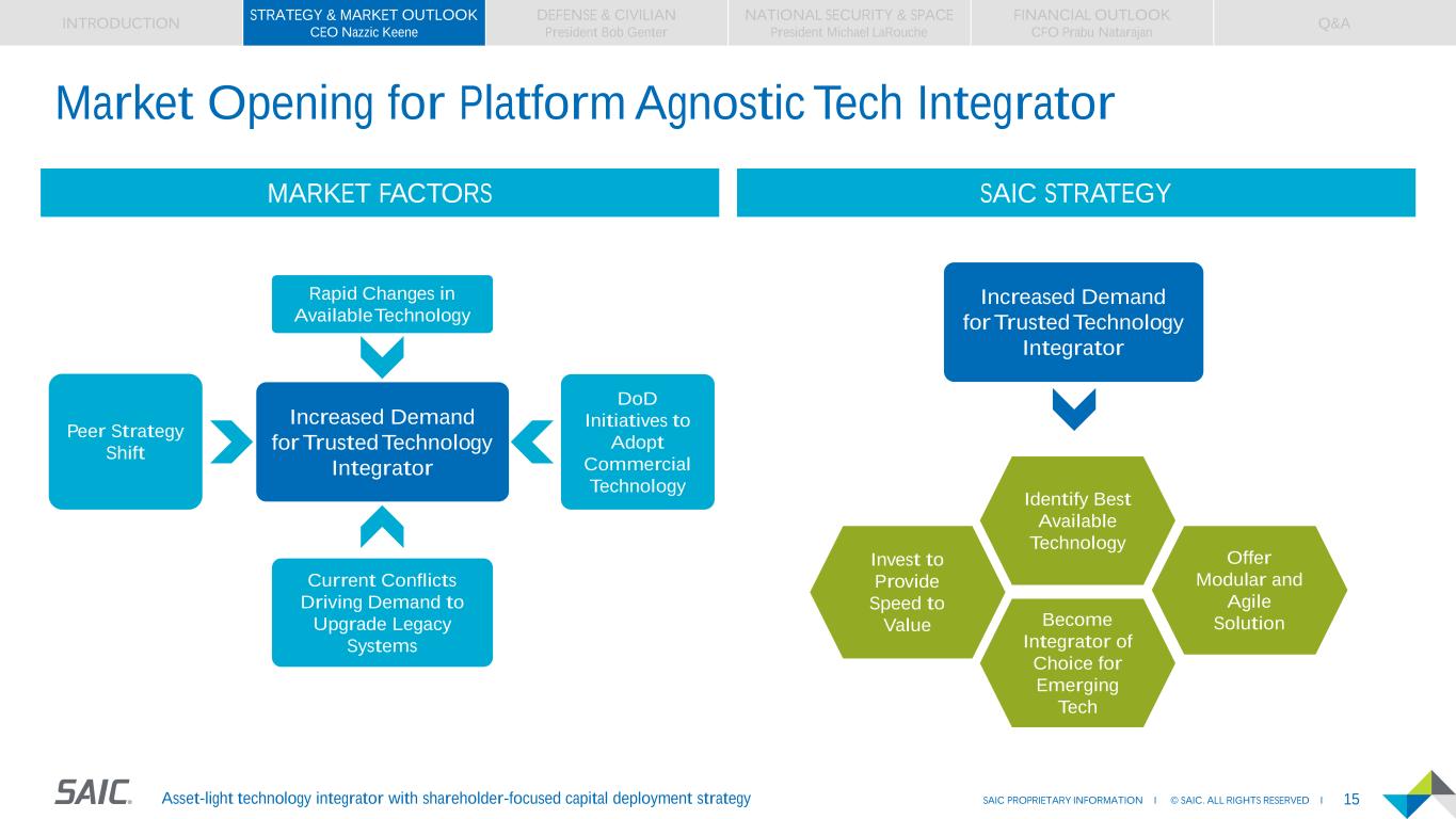 14SAIC PROPRIETARY INFORMATION I © SAIC. ALL RIGHTS RESERVED IAsset-light technology integrator with shareholder-focused capital deployment strategy Pipeline Aligned to Drive Higher GTA, Improved Margins Growth and Technology (GTA) Core Business 40% 60% FY23 SUBMITS FY24-26 PIPELINE COMPOSITION (ESTIMATED) We continue to shift near-term activity towards GTA… ...in an effort to capture this higher-margin work 8.4 10.7~11% High 8% GTACore AVG. EBITDA MARGIN* % FOR FY24-26 PIPELINE (ESTIMATED) Core GTA <50% Core >50% GTA INTRODUCTION STRATEGY & MARKET OUTLOOK CEO Nazzic Keene DEFENSE & CIVILIAN President Bob Genter NATIONAL SECURITY & SPACE President Michael LaRouche FINANCIAL OUTLOOK CFO Prabu Natarajan Q&A Good Momentum to Drive GTA ~40% of Revenues by FY26 * A non-GAAP financial measure. Such non-GAAP measure should be considered in addition to, not a substitute for, the corresponding GAAP financial measure