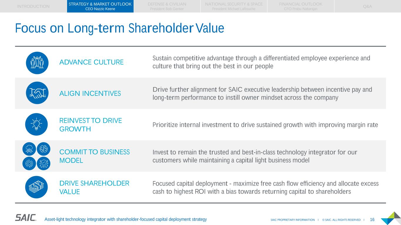 15SAIC PROPRIETARY INFORMATION I © SAIC. ALL RIGHTS RESERVED IAsset-light technology integrator with shareholder-focused capital deployment strategy Market Opening for Platform Agnostic Tech Integrator MARKET FACTORS SAIC STRATEGY Invest to Provide Speed to Value Identify Best Available Technology Offer Modular and Agile SolutionBecome Integrator of Choice for Emerging Tech Rapid Changes in Available Technology Peer Strategy Shift DoD Initiatives to Adopt Commercial Technology Current Conflicts Driving Demand to Upgrade Legacy Systems Increased Demand for TrustedTechnology Integrator Increased Demand for TrustedTechnology Integrator INTRODUCTION STRATEGY & MARKET OUTLOOK CEO Nazzic Keene DEFENSE & CIVILIAN President Bob Genter NATIONAL SECURITY & SPACE President Michael LaRouche FINANCIAL OUTLOOK CFO Prabu Natarajan Q&A