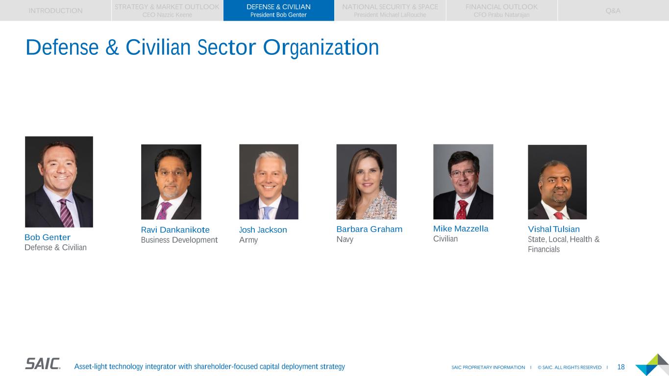 16SAIC PROPRIETARY INFORMATION I © SAIC. ALL RIGHTS RESERVED IAsset-light technology integrator with shareholder-focused capital deployment strategy ADVANCE CULTURE Sustain competitive advantage through a differentiated employee experience and culture that bring out the best in our people ALIGN INCENTIVES Drive further alignment for SAIC executive leadership between incentive pay and long-term performance to instill owner mindset across the company REINVEST TO DRIVE GROWTH Prioritize internal investment to drive sustained growth with improving margin rate COMMIT TO BUSINESS MODEL Invest to remain the trusted and best-in-class technology integrator for our customers while maintaining a capital light business model DRIVE SHAREHOLDER VALUE Focused capital deployment - maximize free cash flow efficiency and allocate excess cash to highest ROI with a bias towards returning capital to shareholders Focus on Long-term Shareholder Value INTRODUCTION STRATEGY & MARKET OUTLOOK CEO Nazzic Keene DEFENSE & CIVILIAN President Bob Genter NATIONAL SECURITY & SPACE President Michael LaRouche FINANCIAL OUTLOOK CFO Prabu Natarajan Q&A