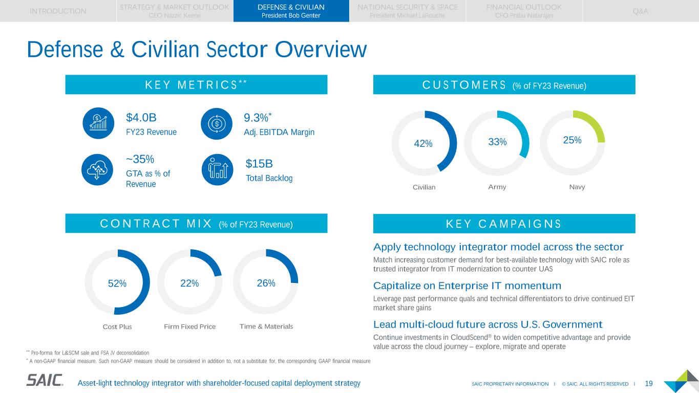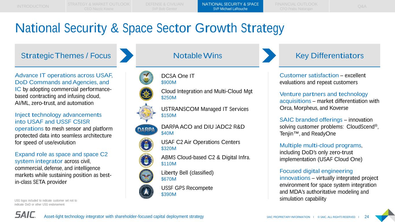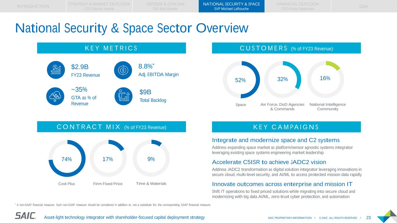 23SAIC PROPRIETARY INFORMATION I © SAIC. ALL RIGHTS RESERVED IAsset-light technology integrator with shareholder-focused capital deployment strategy National Security & Space Sector Overview K E Y M E T R I C S $2.9B FY23 Revenue 8.8%* Adj. EBITDA Margin $9B Total Backlog Cost Plus Firm Fixed Price Time & Materials C O N T R A C T M I X (% of FY23 Revenue) Space Air Force, DoD Agencies & Commands National Intelligence Community C U S TO M E R S (% of FY23 Revenue) 74% 17% 9% 52% 32% 16% K E Y C A M PA I G N S Integrate and modernize space and C2 systems Address expanding space market as platform/sensor agnostic systems integrator leveraging existing space systems engineering market leadership Accelerate C5ISR to achieve JADC2 vision Address JADC2 transformation as digital solution integrator leveraging innovations in secure cloud, multi-level security, and AI/ML to access protected mission data rapidly Innovate outcomes across enterprise and mission IT Shift IT operations to fixed priced solutions while migrating into secure cloud and modernizing with big data AI/ML, zero-trust cyber protection, and automation INTRODUCTION STRATEGY & MARKET OUTLOOK CEO Nazzic Keene DEFENSE & CIVILIAN SVP Bob Genter NATIONAL SECURITY & SPACE SVP Michael LaRouche FINANCIAL OUTLOOK CFO Prabu Natarajan Q&A ~35% GTA as % of Revenue * A non-GAAP financial measure. Such non-GAAP measure should be considered in addition to, not a substitute for, the corresponding GAAP financial measure