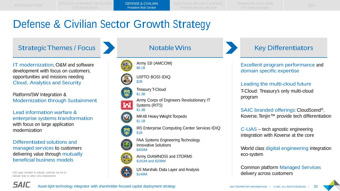 19SAIC PROPRIETARY INFORMATION I © SAIC. ALL RIGHTS RESERVED IAsset-light technology integrator with shareholder-focused capital deployment strategy Defense & Civilian Sector Overview $4.0B FY23 Revenue 9.3%* Adj. EBITDA Margin $15B Total Backlog Cost Plus Firm Fixed Price Time & Materials Civilian Army Navy 52% 22% 26% 42% 33% 25% ** Pro-forma for L&SCM sale and FSA JV deconsolidation ~35% GTA as % of Revenue INTRODUCTION STRATEGY & MARKET OUTLOOK CEO Nazzic Keene DEFENSE & CIVILIAN President Bob Genter NATIONAL SECURITY & SPACE President Michael LaRouche FINANCIAL OUTLOOK CFO Prabu Natarajan Q&A * A non-GAAP financial measure. Such non-GAAP measure should be considered in addition to, not a substitute for, the corresponding GAAP financial measure K E Y M E T R I C S * * C O N T R A C T M I X (% of FY23 Revenue) C U S TO M E R S (% of FY23 Revenue) K E Y C A M PA I G N S Apply technology integrator model across the sector Match increasing customer demand for best-available technology with SAIC role as trusted integrator from IT modernization to counter UAS Capitalize on Enterprise IT momentum Leverage past performance quals and technical differentiators to drive continued EIT market share gains Lead multi-cloud future across U.S. Government Continue investments in CloudScend® to widen competitive advantage and provide value across the cloud journey – explore, migrate and operate