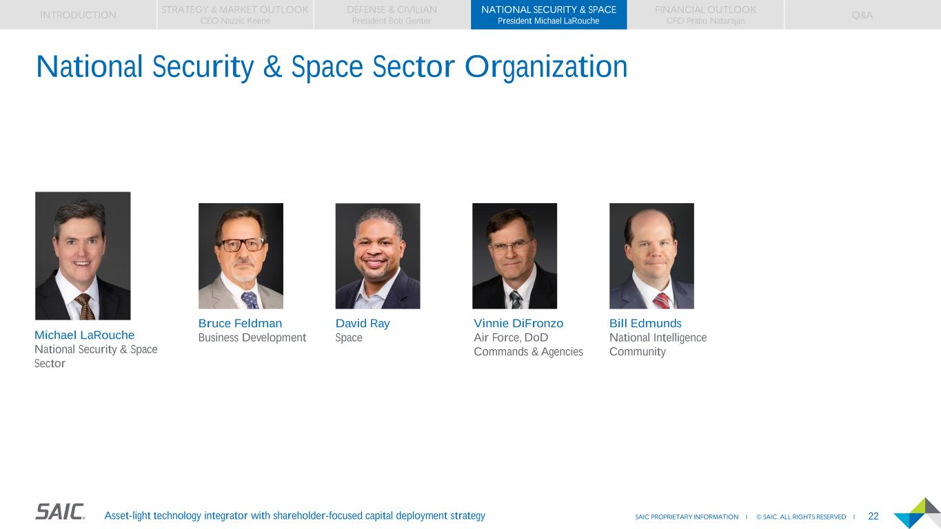 22SAIC PROPRIETARY INFORMATION I © SAIC. ALL RIGHTS RESERVED IAsset-light technology integrator with shareholder-focused capital deployment strategy National Security & Space Sector Organization INTRODUCTION STRATEGY & MARKET OUTLOOK CEO Nazzic Keene DEFENSE & CIVILIAN President Bob Genter NATIONAL SECURITY & SPACE President Michael LaRouche FINANCIAL OUTLOOK CFO Prabu Natarajan Q&A Michael LaRouche National Security & Space Sector Bruce Feldman Business Development David Ray Space Vinnie DiFronzo Air Force, DoD Commands & Agencies Bill Edmunds National Intelligence Community