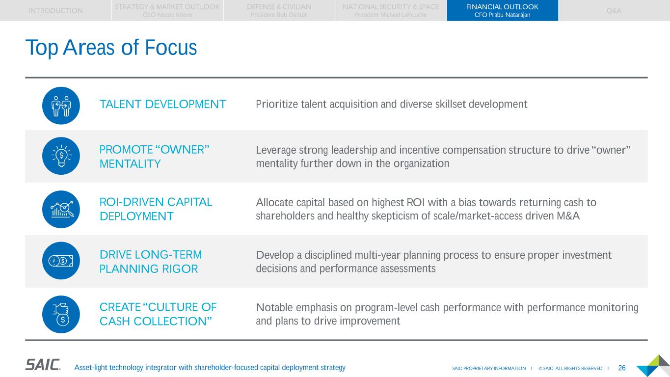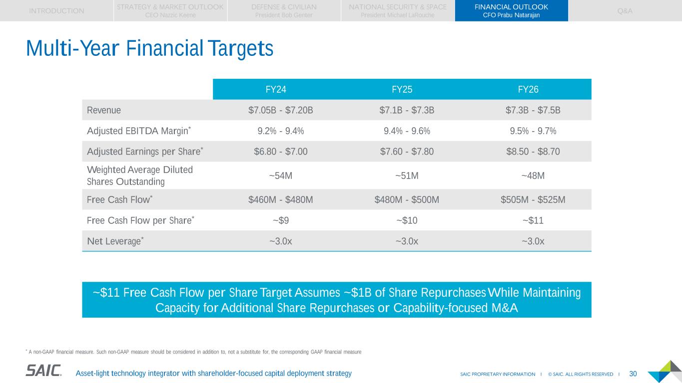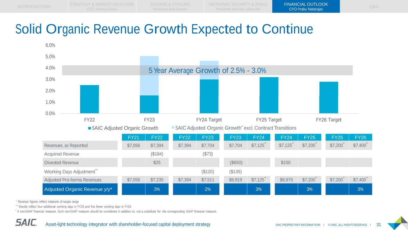 30SAIC PROPRIETARY INFORMATION I © SAIC. ALL RIGHTS RESERVED IAsset-light technology integrator with shareholder-focused capital deployment strategy FY24 FY25 FY26 Revenue $7.05B - $7.20B $7.1B - $7.3B $7.3B - $7.5B Adjusted EBITDA Margin* 9.2% - 9.4% 9.4% - 9.6% 9.5% - 9.7% Adjusted Earnings per Share* $6.80 - $7.00 $7.60 - $7.80 $8.50 - $8.70 Weighted Average Diluted Shares Outstanding ~54M ~51M ~48M Free Cash Flow* $460M - $480M $480M - $500M $505M - $525M Free Cash Flow per Share* ~$9 ~$10 ~$11 Net Leverage* ~3.0x ~3.0x ~3.0x Multi-Year Financial Targets INTRODUCTION STRATEGY & MARKET OUTLOOK CEO Nazzic Keene DEFENSE & CIVILIAN President Bob Genter NATIONAL SECURITY & SPACE President Michael LaRouche FINANCIAL OUTLOOK CFO Prabu Natarajan Q&A * A non-GAAP financial measure. Such non-GAAP measure should be considered in addition to, not a substitute for, the corresponding GAAP financial measure ~$11 Free Cash Flow per Share Target Assumes ~$1B of Share Repurchases While Maintaining Capacity for Additional Share Repurchases or Capability-focused M&A