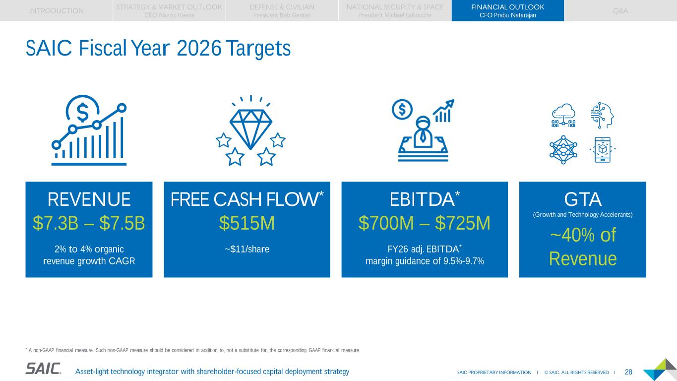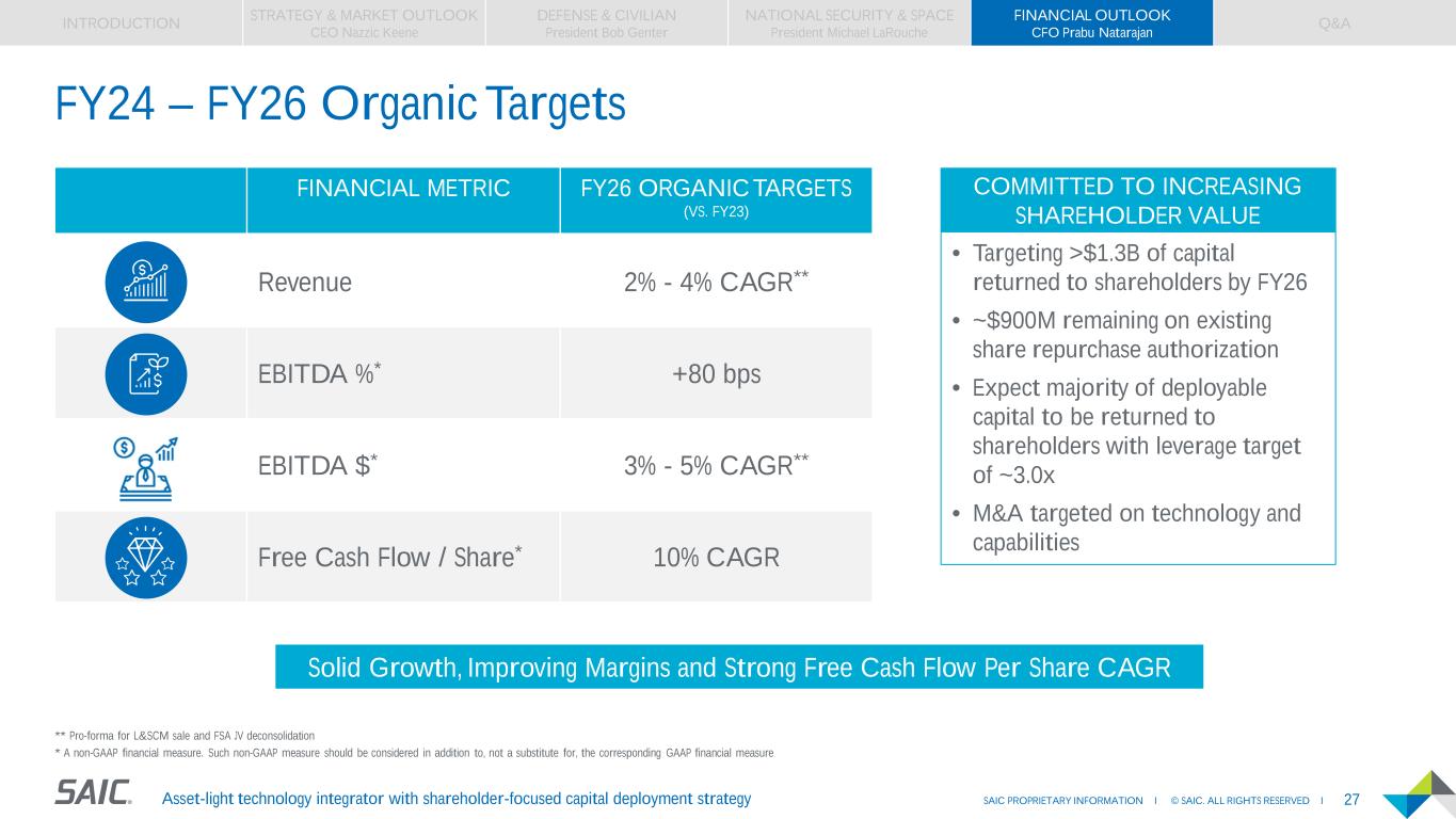 27SAIC PROPRIETARY INFORMATION I © SAIC. ALL RIGHTS RESERVED IAsset-light technology integrator with shareholder-focused capital deployment strategy FINANCIAL METRIC FY26 ORGANIC TARGETS (VS. FY23) Revenue 2% - 4% CAGR** EBITDA %* +80 bps EBITDA $* 3% - 5% CAGR** Free Cash Flow / Share* 10% CAGR FY24 – FY26 Organic Targets Solid Growth, Improving Margins and Strong Free Cash Flow Per Share CAGR COMMITTED TO INCREASING SHAREHOLDER VALUE • Targeting >$1.3B of capital returned to shareholders by FY26 • ~$900M remaining on existing share repurchase authorization • Expect majority of deployable capital to be returned to shareholders with leverage target of ~3.0x • M&A targeted on technology and capabilities INTRODUCTION STRATEGY & MARKET OUTLOOK CEO Nazzic Keene DEFENSE & CIVILIAN President Bob Genter NATIONAL SECURITY & SPACE President Michael LaRouche FINANCIAL OUTLOOK CFO Prabu Natarajan Q&A * A non-GAAP financial measure. Such non-GAAP measure should be considered in addition to, not a substitute for, the corresponding GAAP financial measure ** Pro-forma for L&SCM sale and FSA JV deconsolidation