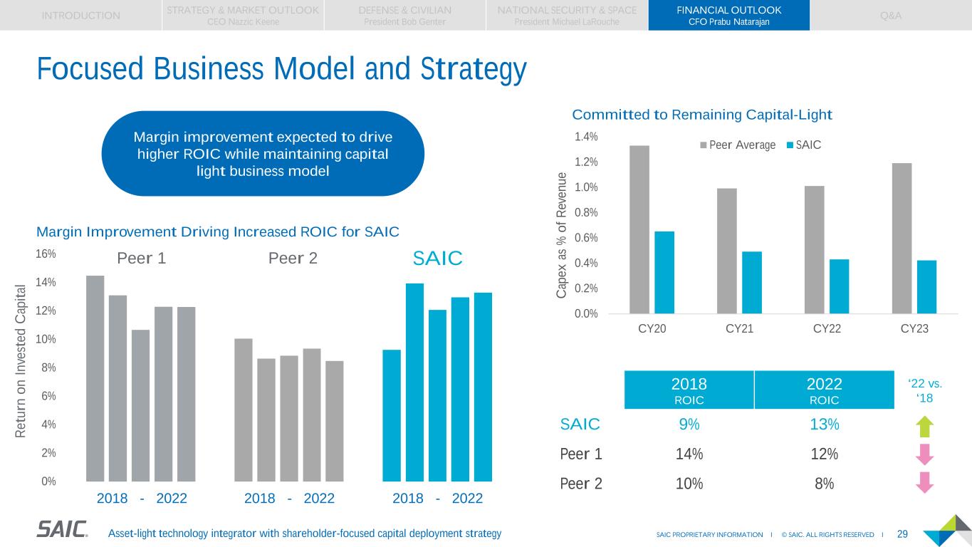 29SAIC PROPRIETARY INFORMATION I © SAIC. ALL RIGHTS RESERVED IAsset-light technology integrator with shareholder-focused capital deployment strategy Committed to Remaining Capital-Light Margin Improvement Driving Increased ROIC for SAIC 0.0% 0.2% 0.4% 0.6% 0.8% 1.0% 1.2% 1.4% CY20 CY21 CY22 CY23 C ap ex a s % o f R ev en ue Peer Average SAIC 2018 ROIC 2022 ROIC ‘22 vs. ‘18 SAIC 9% 13% Peer 1 14% 12% Peer 2 10% 8% Margin improvement expected to drive higher ROIC while maintaining capital light business model INTRODUCTION STRATEGY & MARKET OUTLOOK CEO Nazzic Keene DEFENSE & CIVILIAN President Bob Genter NATIONAL SECURITY & SPACE President Michael LaRouche FINANCIAL OUTLOOK CFO Prabu Natarajan Q&A Focused Business Model and Strategy 0% 2% 4% 6% 8% 10% 12% 14% 16% Peer 1 Peer 2 SAIC 2018 - 2022 2018 - 2022 2018 - 2022 R et ur n on In ve st ed C ap ita l