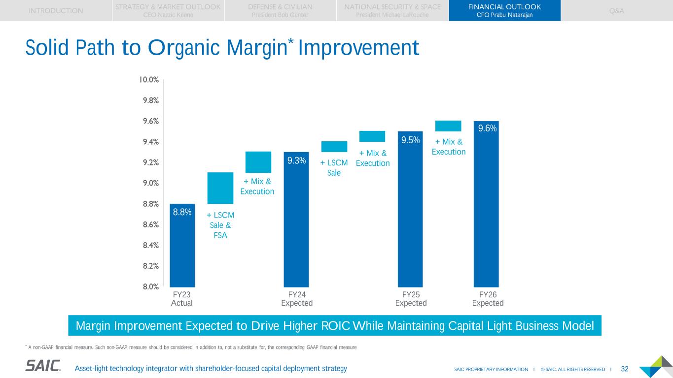 32SAIC PROPRIETARY INFORMATION I © SAIC. ALL RIGHTS RESERVED IAsset-light technology integrator with shareholder-focused capital deployment strategy Solid Path to Organic Margin* Improvement FY23 Actual + LSCM Sale & FSA + LSCM Sale + Mix & Execution + Mix & Execution + Mix & Execution FY24 Expected FY25 Expected FY26 Expected 8.8% 9.6% 9.3% 9.5% INTRODUCTION STRATEGY & MARKET OUTLOOK CEO Nazzic Keene DEFENSE & CIVILIAN President Bob Genter NATIONAL SECURITY & SPACE President Michael LaRouche FINANCIAL OUTLOOK CFO Prabu Natarajan Q&A Margin Improvement Expected to Drive Higher ROIC While Maintaining Capital Light Business Model * A non-GAAP financial measure. Such non-GAAP measure should be considered in addition to, not a substitute for, the corresponding GAAP financial measure