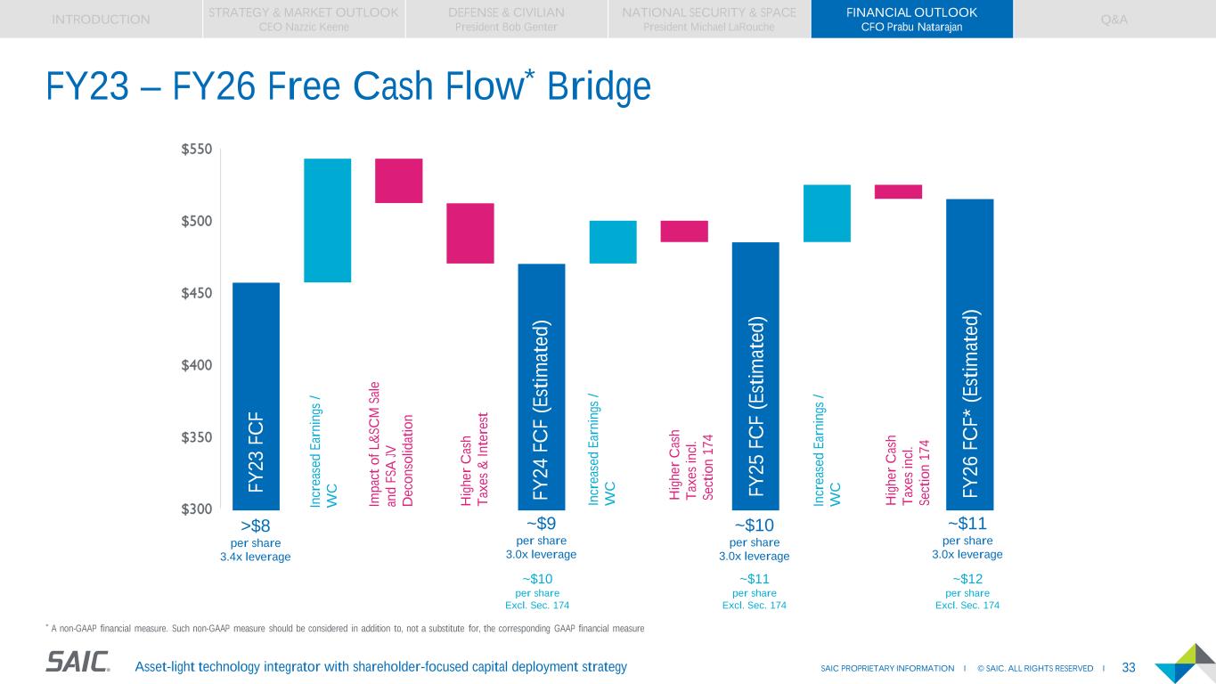 33SAIC PROPRIETARY INFORMATION I © SAIC. ALL RIGHTS RESERVED IAsset-light technology integrator with shareholder-focused capital deployment strategy FY23 – FY26 Free Cash Flow* Bridge FY 23 F C F In cr ea se d Ea rn in gs / W C Im pa ct o f L & SC M S al e an d FS A JV D ec on so lid at io n H ig he r C as h T ax es & In te re st FY 24 F C F (E st im at ed ) In cr ea se d Ea rn in gs / W C H ig he r C as h T ax es in cl . Se ct io n 17 4 FY 25 F C F (E st im at ed ) FY 26 F C F* ( Es tim at ed ) >$8 per share 3.4x leverage ~$9 per share 3.0x leverage In cr ea se d Ea rn in gs / W C H ig he r C as h T ax es in cl . Se ct io n 17 4 ~$10 per share 3.0x leverage ~$11 per share 3.0x leverage ~$10 per share Excl. Sec. 174 ~$11 per share Excl. Sec. 174 ~$12 per share Excl. Sec. 174 FY 26 F C F INTRODUCTION STRATEGY & MARKET OUTLOOK CEO Nazzic Keene DEFENSE & CIVILIAN President Bob Genter NATIONAL SECURITY & SPACE President Michael LaRouche FINANCIAL OUTLOOK CFO Prabu Natarajan Q&A * A non-GAAP financial measure. Such non-GAAP measure should be considered in addition to, not a substitute for, the corresponding GAAP financial measure
