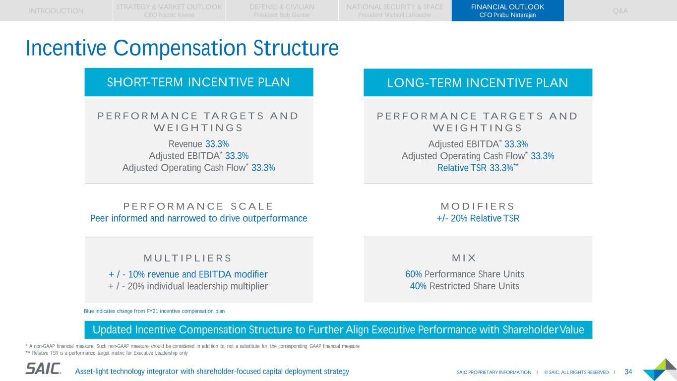 34SAIC PROPRIETARY INFORMATION I © SAIC. ALL RIGHTS RESERVED IAsset-light technology integrator with shareholder-focused capital deployment strategy Incentive Compensation Structure INTRODUCTION STRATEGY & MARKET OUTLOOK CEO Nazzic Keene DEFENSE & CIVILIAN President Bob Genter NATIONAL SECURITY & SPACE President Michael LaRouche FINANCIAL OUTLOOK CFO Prabu Natarajan Q&A P E R F O R M A N C E TA R G E T S A N D W E I G H T I N G S Revenue 33.3% Adjusted EBITDA* 33.3% Adjusted Operating Cash Flow* 33.3% P E R F O R M A N C E S C A L E Peer informed and narrowed to drive outperformance M U LT I P L I E R S + / - 10% revenue and EBITDA modifier + / - 20% individual leadership multiplier P E R F O R M A N C E TA R G E T S A N D W E I G H T I N G S Adjusted EBITDA* 33.3% Adjusted Operating Cash Flow* 33.3% Relative TSR 33.3%** M O D I F I E R S +/- 20% Relative TSR M I X 60% Performance Share Units 40% Restricted Share Units Updated Incentive Compensation Structure to Further Align Executive Performance with Shareholder Value SHORT-TERM INCENTIVE PLAN LONG-TERM INCENTIVE PLAN Blue indicates change from FY21 incentive compensation plan * A non-GAAP financial measure. Such non-GAAP measure should be considered in addition to, not a substitute for, the corresponding GAAP financial measure ** Relative TSR is a performance target metric for Executive Leadership only