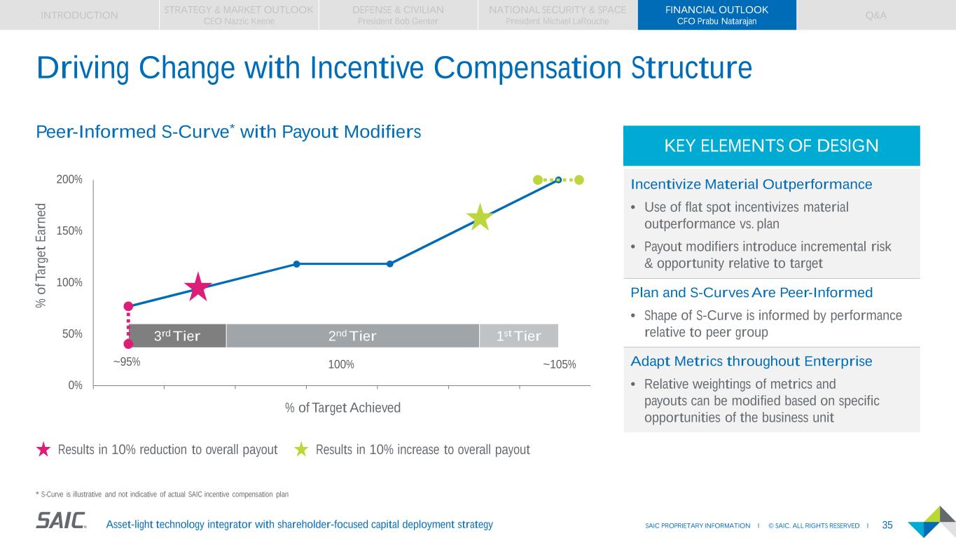 35SAIC PROPRIETARY INFORMATION I © SAIC. ALL RIGHTS RESERVED IAsset-light technology integrator with shareholder-focused capital deployment strategy Driving Change with Incentive Compensation Structure INTRODUCTION STRATEGY & MARKET OUTLOOK CEO Nazzic Keene DEFENSE & CIVILIAN President Bob Genter NATIONAL SECURITY & SPACE President Michael LaRouche FINANCIAL OUTLOOK CFO Prabu Natarajan Q&A 0% 50% 100% 150% 200% 85% 90% 99% 100% 101% 110% 115% 3rd Tier 2nd Tier 1st Tier % o f T ar ge t Ea rn ed ~95% 100% ~105% % of Target Achieved Peer-Informed S-Curve* with Payout Modifiers Incentivize Material Outperformance • Use of flat spot incentivizes material outperformance vs. plan • Payout modifiers introduce incremental risk & opportunity relative to target Plan and S-Curves Are Peer-Informed • Shape of S-Curve is informed by performance relative to peer group Adapt Metrics throughout Enterprise • Relative weightings of metrics and payouts can be modified based on specific opportunities of the business unit KEY ELEMENTS OF DESIGN * S-Curve is illustrative and not indicative of actual SAIC incentive compensation plan Results in 10% reduction to overall payout Results in 10% increase to overall payout