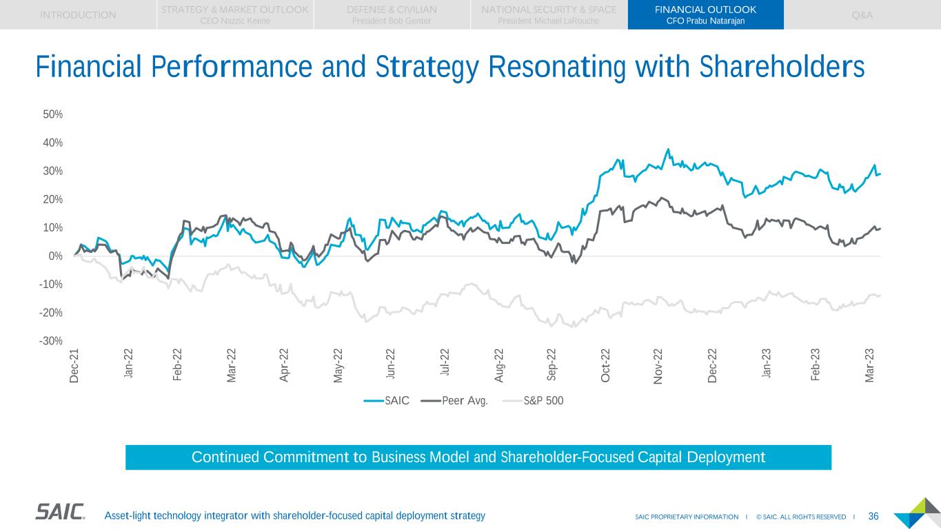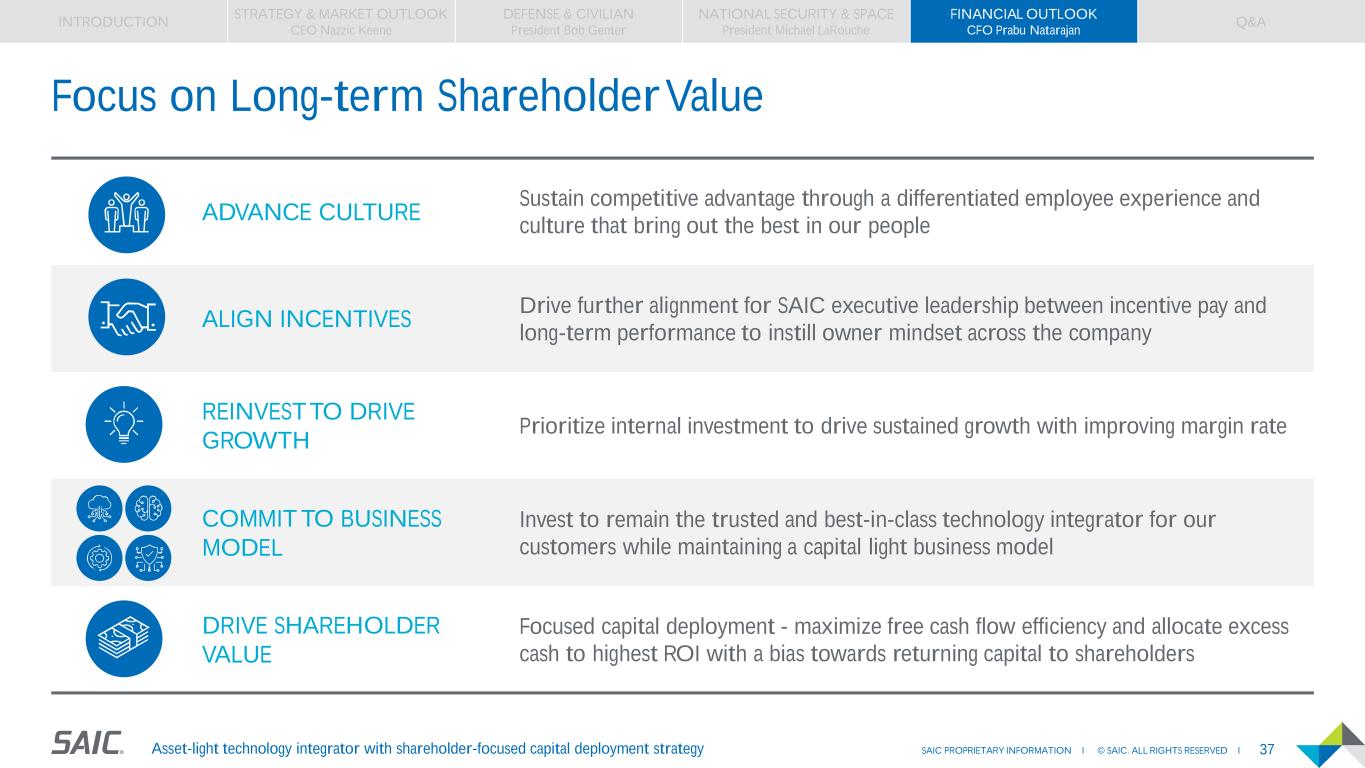 36SAIC PROPRIETARY INFORMATION I © SAIC. ALL RIGHTS RESERVED IAsset-light technology integrator with shareholder-focused capital deployment strategy Financial Performance and Strategy Resonating with Shareholders -30% -20% -10% 0% 10% 20% 30% 40% 50% D ec -2 1 Ja n- 22 Fe b- 22 M ar -2 2 A pr -2 2 M ay -2 2 Ju n- 22 Ju l-2 2 A ug -2 2 Se p- 22 O ct -2 2 N ov -2 2 D ec -2 2 Ja n- 23 Fe b- 23 M ar -2 3 SAIC Peer Avg. S&P 500 INTRODUCTION STRATEGY & MARKET OUTLOOK CEO Nazzic Keene DEFENSE & CIVILIAN President Bob Genter NATIONAL SECURITY & SPACE President Michael LaRouche FINANCIAL OUTLOOK CFO Prabu Natarajan Q&A Continued Commitment to Business Model and Shareholder-Focused Capital Deployment