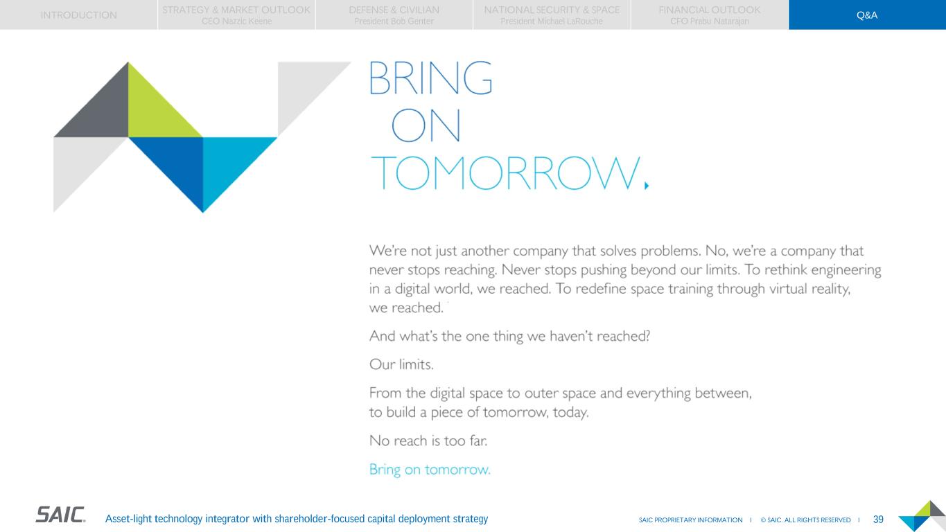 39SAIC PROPRIETARY INFORMATION I © SAIC. ALL RIGHTS RESERVED IAsset-light technology integrator with shareholder-focused capital deployment strategy INTRODUCTION STRATEGY & MARKET OUTLOOK CEO Nazzic Keene DEFENSE & CIVILIAN President Bob Genter NATIONAL SECURITY & SPACE President Michael LaRouche FINANCIAL OUTLOOK CFO Prabu Natarajan Q&A