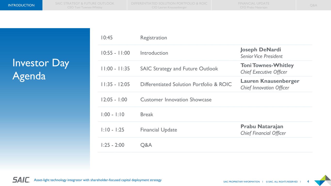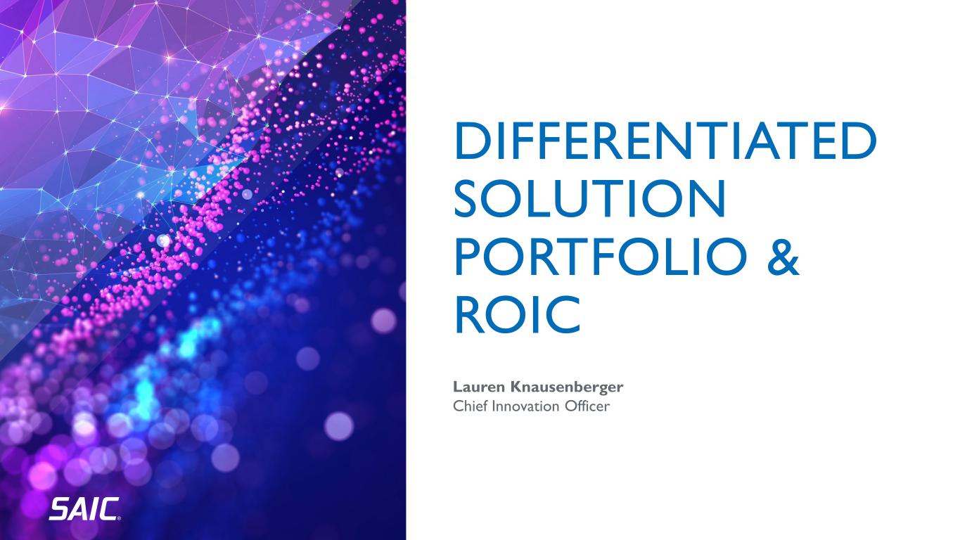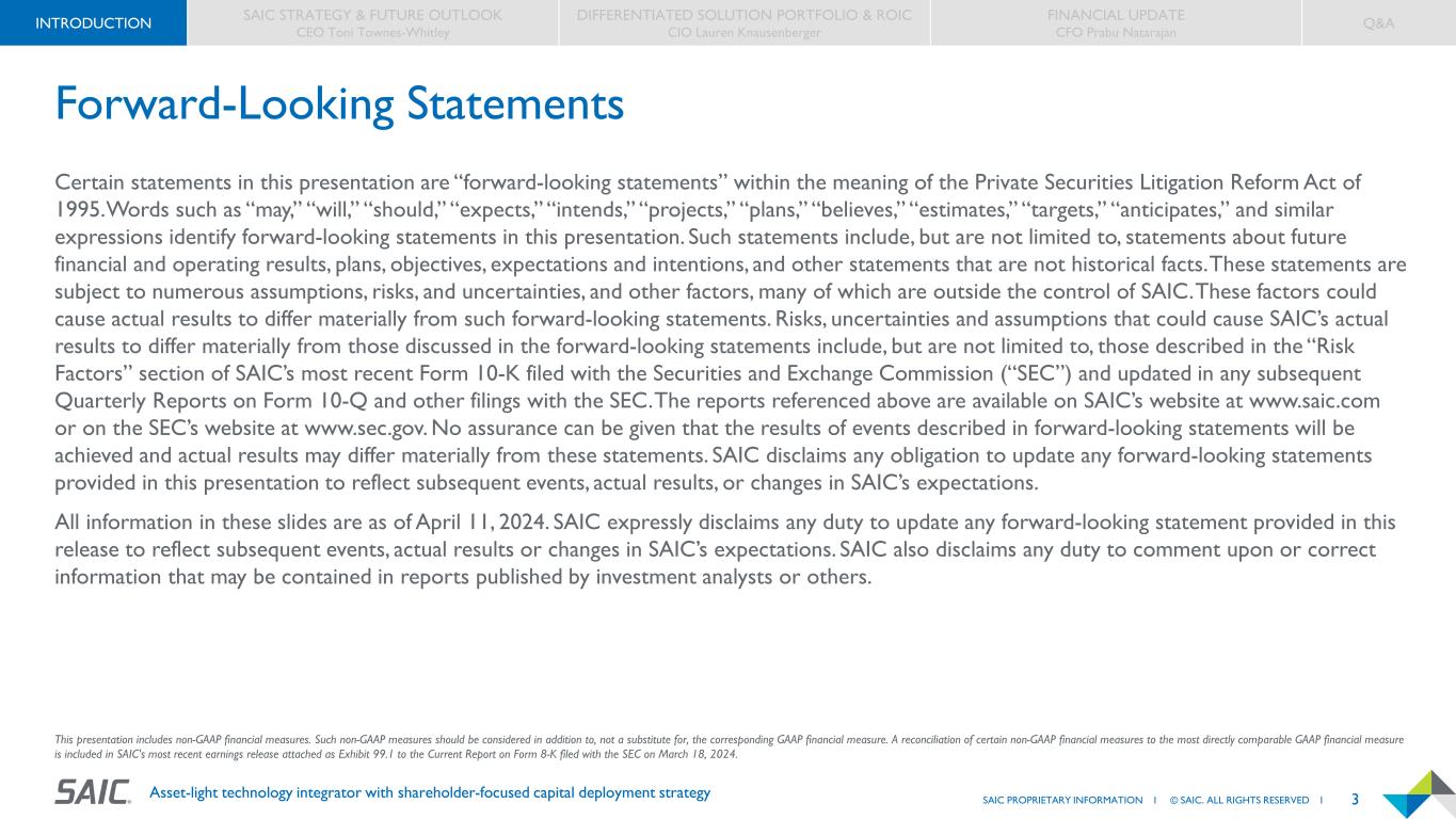 3SAIC PROPRIETARY INFORMATION I © SAIC. ALL RIGHTS RESERVED I Asset-light technology integrator with shareholder-focused capital deployment strategy Forward-Looking Statements Certain statements in this presentation are “forward-looking statements” within the meaning of the Private Securities Litigation Reform Act of 1995. Words such as “may,” “will,” “should,” “expects,” “intends,” “projects,” “plans,” “believes,” “estimates,” “targets,” “anticipates,” and similar expressions identify forward-looking statements in this presentation. Such statements include, but are not limited to, statements about future financial and operating results, plans, objectives, expectations and intentions, and other statements that are not historical facts. These statements are subject to numerous assumptions, risks, and uncertainties, and other factors, many of which are outside the control of SAIC. These factors could cause actual results to differ materially from such forward-looking statements. Risks, uncertainties and assumptions that could cause SAIC’s actual results to differ materially from those discussed in the forward-looking statements include, but are not limited to, those described in the “Risk Factors” section of SAIC’s most recent Form 10-K filed with the Securities and Exchange Commission (“SEC”) and updated in any subsequent Quarterly Reports on Form 10-Q and other filings with the SEC. The reports referenced above are available on SAIC’s website at www.saic.com or on the SEC’s website at www.sec.gov. No assurance can be given that the results of events described in forward-looking statements will be achieved and actual results may differ materially from these statements. SAIC disclaims any obligation to update any forward-looking statements provided in this presentation to reflect subsequent events, actual results, or changes in SAIC’s expectations. All information in these slides are as of April 11, 2024. SAIC expressly disclaims any duty to update any forward-looking statement provided in this release to reflect subsequent events, actual results or changes in SAIC’s expectations. SAIC also disclaims any duty to comment upon or correct information that may be contained in reports published by investment analysts or others. This presentation includes non-GAAP financial measures. Such non-GAAP measures should be considered in addition to, not a substitute for, the corresponding GAAP financial measure. A reconciliation of certain non-GAAP financial measures to the most directly comparable GAAP financial measure is included in SAIC's most recent earnings release attached as Exhibit 99.1 to the Current Report on Form 8-K filed with the SEC on March 18, 2024. INTRODUCTION SAIC STRATEGY & FUTURE OUTLOOK CEO Toni Townes-Whitley DIFFERENTIATED SOLUTION PORTFOLIO & ROIC CIO Lauren Knausenberger FINANCIAL UPDATE CFO Prabu Natarajan Q&A
