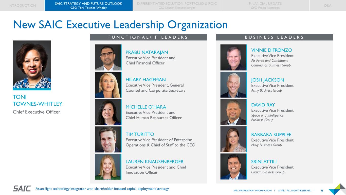4SAIC PROPRIETARY INFORMATION I © SAIC. ALL RIGHTS RESERVED I Asset-light technology integrator with shareholder-focused capital deployment strategy Investor Day Agenda 10:45 Registration 10:55 - 11:00 Introduction Joseph DeNardi Senior Vice President 11:00 - 11:35 SAIC Strategy and Future Outlook Toni Townes-Whitley Chief Executive Officer 11:35 - 12:05 Differentiated Solution Portfolio & ROIC Lauren Knausenberger Chief Innovation Officer 12:05 - 1:00 Customer Innovation Showcase 1:00 - 1:10 Break 1:10 - 1:25 Financial Update Prabu Natarajan Chief Financial Officer 1:25 - 2:00 Q&A INTRODUCTION SAIC STRATEGY & FUTURE OUTLOOK CEO Toni Townes-Whitley DIFFERENTIATED SOLUTION PORTFOLIO & ROIC CIO Lauren Knausenberger FINANCIAL UPDATE CFO Prabu Natarajan Q&A