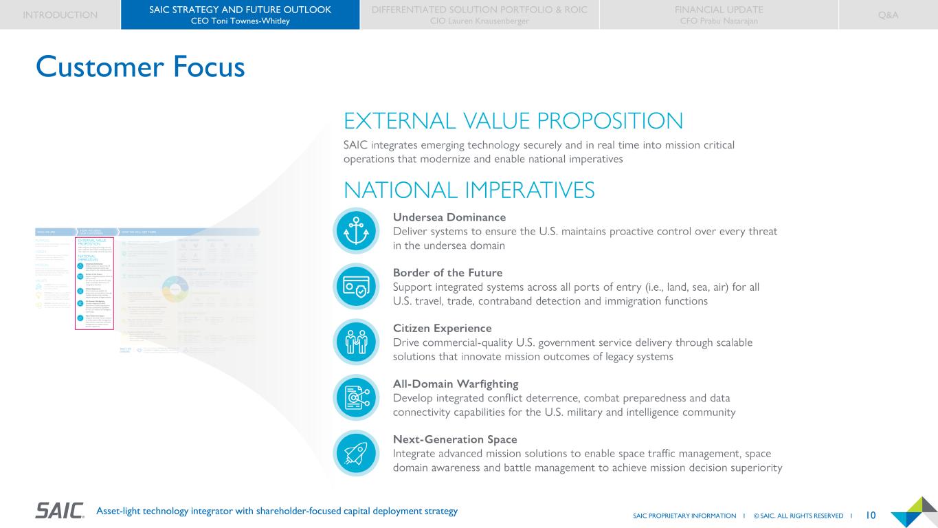 9SAIC PROPRIETARY INFORMATION I © SAIC. ALL RIGHTS RESERVED I Asset-light technology integrator with shareholder-focused capital deployment strategy SAIC Enterprise Growth Strategy Overview INTRODUCTION SAIC STRATEGY AND FUTURE OUTLOOK CEO Toni Townes-Whitley DIFFERENTIATED SOLUTION PORTFOLIO & ROIC CIO Lauren Knausenberger FINANCIAL UPDATE CFO Prabu Natarajan Q&A