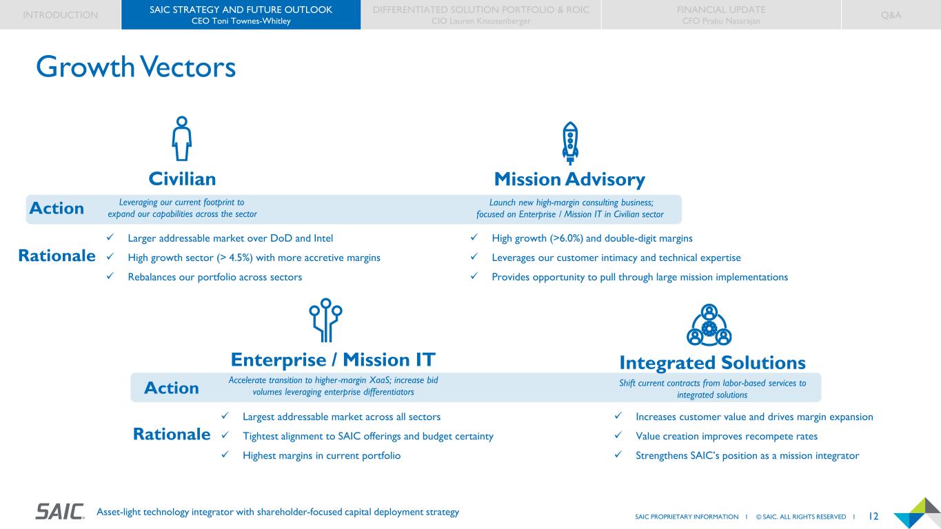 11SAIC PROPRIETARY INFORMATION I © SAIC. ALL RIGHTS RESERVED I Asset-light technology integrator with shareholder-focused capital deployment strategy Portfolio Pivot INTRODUCTION SAIC STRATEGY AND FUTURE OUTLOOK CEO Toni Townes-Whitley DIFFERENTIATED SOLUTION PORTFOLIO & ROIC CIO Lauren Knausenberger FINANCIAL UPDATE CFO Prabu Natarajan Q&A