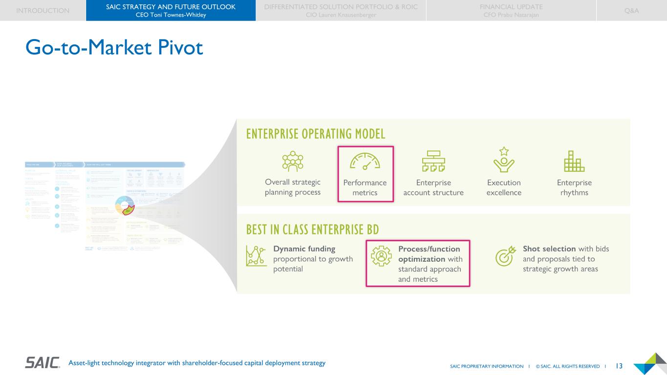 12SAIC PROPRIETARY INFORMATION I © SAIC. ALL RIGHTS RESERVED I Asset-light technology integrator with shareholder-focused capital deployment strategy Growth Vectors INTRODUCTION SAIC STRATEGY AND FUTURE OUTLOOK CEO Toni Townes-Whitley DIFFERENTIATED SOLUTION PORTFOLIO & ROIC CIO Lauren Knausenberger FINANCIAL UPDATE CFO Prabu Natarajan Q&A  Larger addressable market over DoD and Intel  High growth sector (> 4.5%) with more accretive margins  Rebalances our portfolio across sectors  High growth (>6.0%) and double-digit margins  Leverages our customer intimacy and technical expertise  Provides opportunity to pull through large mission implementations  Largest addressable market across all sectors  Tightest alignment to SAIC offerings and budget certainty  Highest margins in current portfolio  Increases customer value and drives margin expansion  Value creation improves recompete rates  Strengthens SAIC’s position as a mission integrator Integrated Solutions Shift current contracts from labor-based services to integrated solutions Enterprise / Mission IT Accelerate transition to higher -margin XaaS; increase bid volumes leveraging enterprise differentiators Civilian Leveraging our current footprint to expand our capabilities across the sector Mission Advisory ​ Launch new high-margin consulting business; focused on Enterprise / Mission IT in Civilian sectorAction Rationale Action Rationale