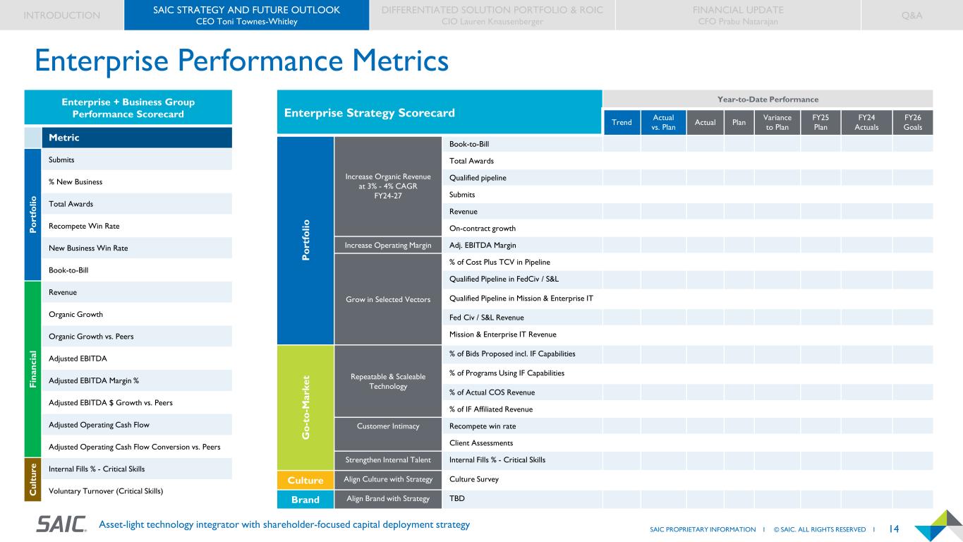 13SAIC PROPRIETARY INFORMATION I © SAIC. ALL RIGHTS RESERVED I Asset-light technology integrator with shareholder-focused capital deployment strategy INTRODUCTION SAIC STRATEGY AND FUTURE OUTLOOK CEO Toni Townes-Whitley DIFFERENTIATED SOLUTION PORTFOLIO & ROIC CIO Lauren Knausenberger FINANCIAL UPDATE CFO Prabu Natarajan Q&A Go-to-Market Pivot