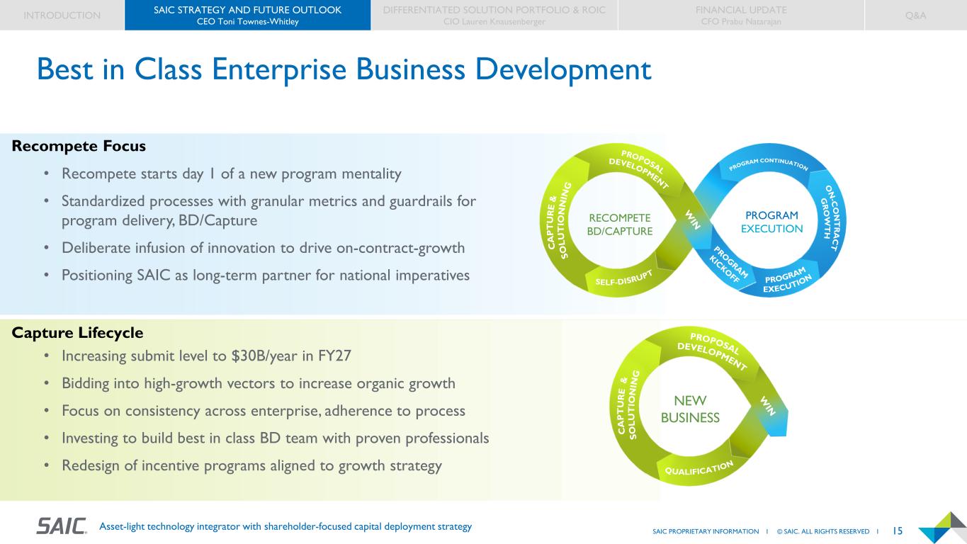 14SAIC PROPRIETARY INFORMATION I © SAIC. ALL RIGHTS RESERVED I Asset-light technology integrator with shareholder-focused capital deployment strategy Enterprise Performance Metrics INTRODUCTION SAIC STRATEGY AND FUTURE OUTLOOK CEO Toni Townes-Whitley DIFFERENTIATED SOLUTION PORTFOLIO & ROIC CIO Lauren Knausenberger FINANCIAL UPDATE CFO Prabu Natarajan Q&A Enterprise Strategy Scorecard Year-to-Date Performance Trend Actual vs. Plan Actual Plan Variance to Plan FY25 Plan FY24 Actuals FY26 Goals P or tf ol io Increase Organic Revenue at 3% - 4% CAGR FY24-27 Book-to-Bill Total Awards Qualified pipeline Submits Revenue On-contract growth Increase Operating Margin Adj. EBITDA Margin Grow in Selected Vectors % of Cost Plus TCV in Pipeline Qualified Pipeline in FedCiv / S&L Qualified Pipeline in Mission & Enterprise IT Fed Civ / S&L Revenue Mission & Enterprise IT Revenue G o- to -M ar ke t Repeatable & Scaleable Technology % of Bids Proposed incl. IF Capabilities % of Programs Using IF Capabilities % of Actual COS Revenue % of IF Affiliated Revenue Customer Intimacy Recompete win rate Client Assessments Strengthen Internal Talent Internal Fills % - Critical Skills Culture Align Culture with Strategy Culture Survey Brand Align Brand with Strategy TBD Enterprise + Business Group Performance Scorecard Metric P or tf ol io Submits % New Business Total Awards Recompete Win Rate New Business Win Rate Book-to-Bill Fi na nc ia l Revenue Organic Growth Organic Growth vs. Peers Adjusted EBITDA Adjusted EBITDA Margin % Adjusted EBITDA $ Growth vs. Peers Adjusted Operating Cash Flow Adjusted Operating Cash Flow Conversion vs. Peers C ul tu re Internal Fills % - Critical Skills Voluntary Turnover (Critical Skills)