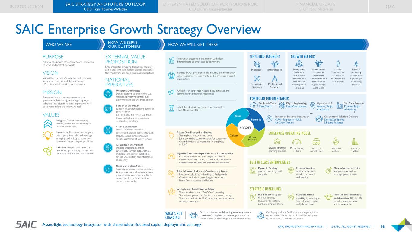 15SAIC PROPRIETARY INFORMATION I © SAIC. ALL RIGHTS RESERVED I Asset-light technology integrator with shareholder-focused capital deployment strategy Best in Class Enterprise Business Development • Recompete starts day 1 of a new program mentality • Standardized processes with granular metrics and guardrails for program delivery, BD/Capture • Deliberate infusion of innovation to drive on-contract-growth • Positioning SAIC as long-term partner for national imperatives • Increasing submit level to $30B/year in FY27 • Bidding into high-growth vectors to increase organic growth • Focus on consistency across enterprise, adherence to process • Investing to build best in class BD team with proven professionals • Redesign of incentive programs aligned to growth strategy RECOMPETE BD/CAPTURE PROGRAM EXECUTION NEW BUSINESS INTRODUCTION SAIC STRATEGY AND FUTURE OUTLOOK CEO Toni Townes-Whitley DIFFERENTIATED SOLUTION PORTFOLIO & ROIC CIO Lauren Knausenberger FINANCIAL UPDATE CFO Prabu Natarajan Q&A Recompete Focus Capture Lifecycle