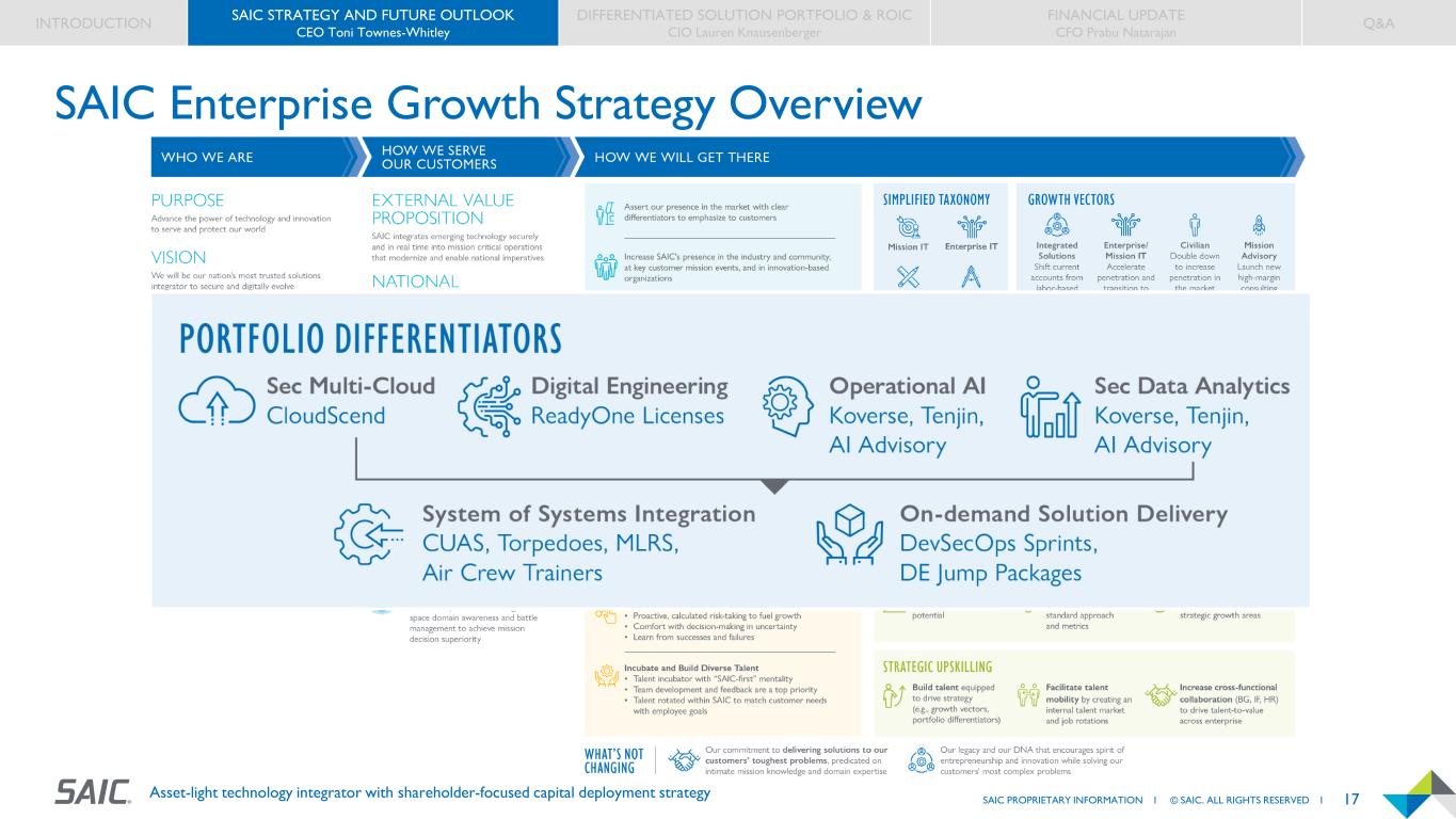16SAIC PROPRIETARY INFORMATION I © SAIC. ALL RIGHTS RESERVED I Asset-light technology integrator with shareholder-focused capital deployment strategy SAIC Enterprise Growth Strategy Overview INTRODUCTION SAIC STRATEGY AND FUTURE OUTLOOK CEO Toni Townes-Whitley DIFFERENTIATED SOLUTION PORTFOLIO & ROIC CIO Lauren Knausenberger FINANCIAL UPDATE CFO Prabu Natarajan Q&A