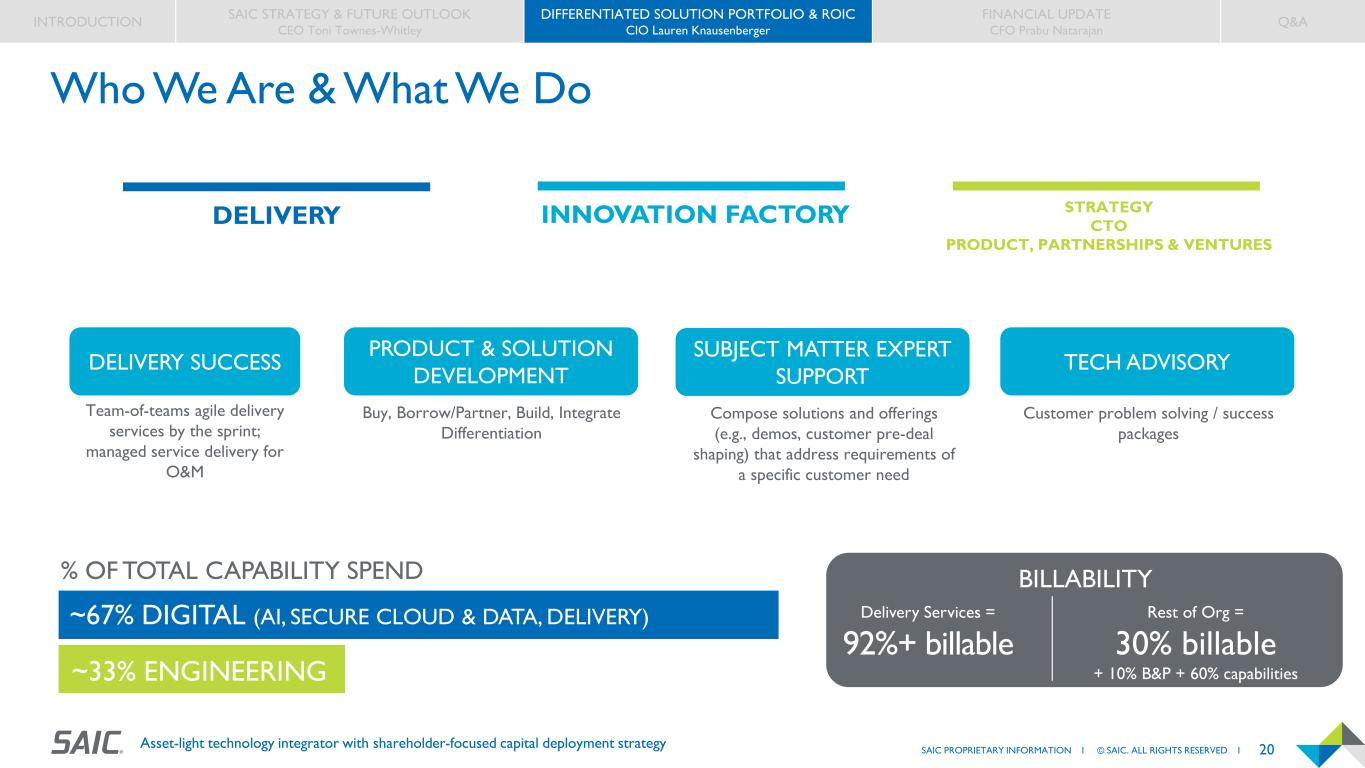 19SAIC PROPRIETARY INFORMATION I © SAIC. ALL RIGHTS RESERVED I Asset-light technology integrator with shareholder-focused capital deployment strategy WHY SAIC? WHY NOW? 19SAIC PROPRIETARY INFORMATION I © SAIC. ALL RIGHTS RESERVED I
