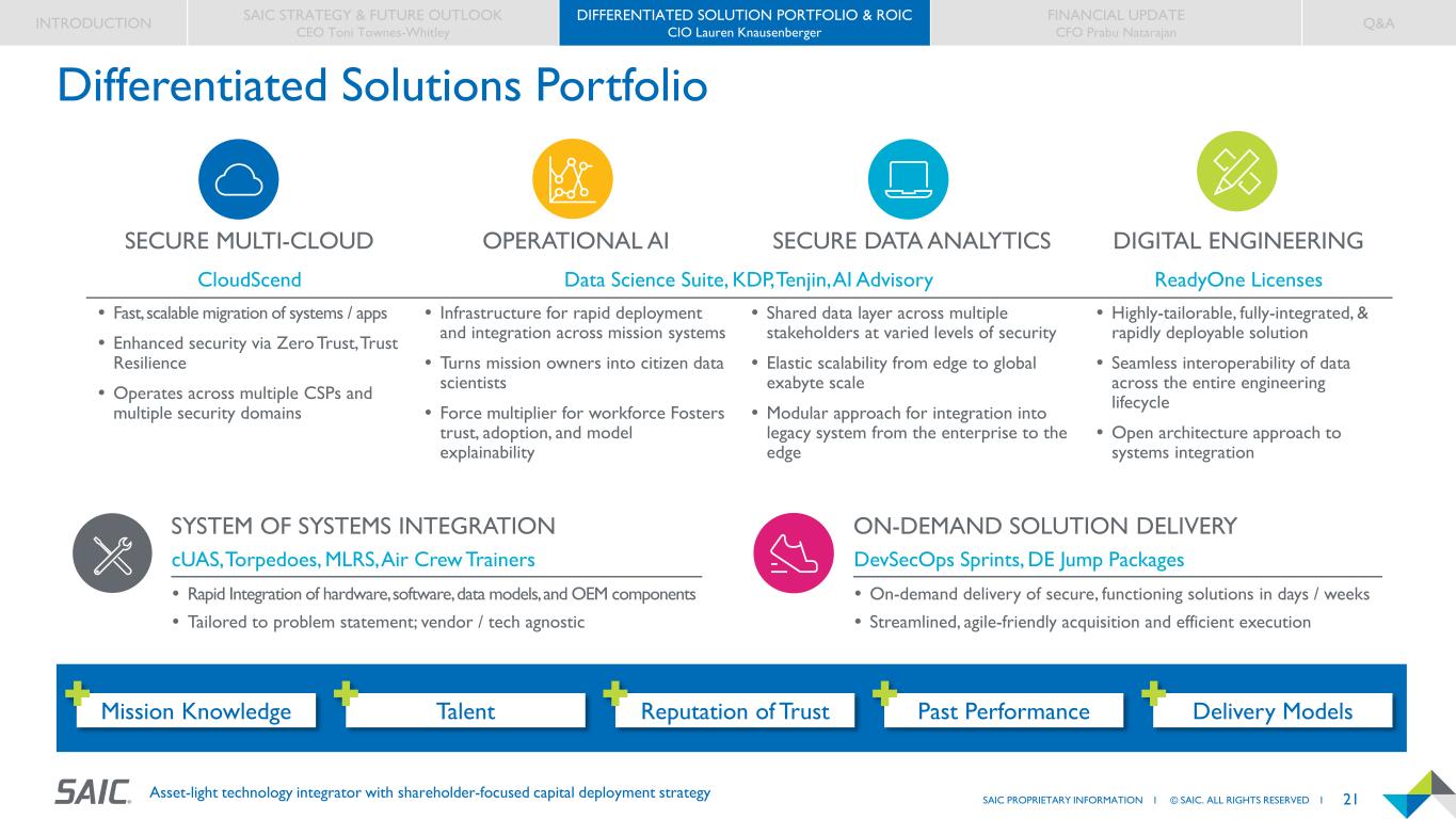 20SAIC PROPRIETARY INFORMATION I © SAIC. ALL RIGHTS RESERVED I Asset-light technology integrator with shareholder-focused capital deployment strategy Who We Are & What We Do Delivery Services = 92%+ billable Rest of Org = 30% billable + 10% B&P + 60% capabilities BILLABILITY Buy, Borrow/Partner, Build, Integrate Differentiation PRODUCT AND SOLUTION DEVELOPMENT Compose solutions and offerings (e.g., demos, customer pre-deal shaping) that address requirements of a specific customer need SME SUPPORT Customer problem solving / success packages TECH ADVISORY Team-of-teams agile delivery services by the sprint; managed service delivery for O&M DELIVERY SUCCESS INTRODUCTION SAIC STRATEGY & FUTURE OUTLOOK CEO Toni Townes-Whitley DIFFERENTIATED SOLUTION PORTFOLIO & ROIC CIO Lauren Knausenberger FINANCIAL UPDATE CFO Prabu Natarajan Q&A DELIVERY INNOVATION FACTORY STRATEGY CTO PRODUCT, PARTNERSHIPS & VENTURES DELIVERY SUCCESS PRODUCT & SOLUTION DEVELOPMENT SUBJECT MATTER EXPERT SUPPORT TECH ADVISORY % OF TOTAL CAPABILITY SPEND ~67% DIGITAL (AI, SECURE CLOUD & DATA, DELIVERY) ~33% ENGINEERING