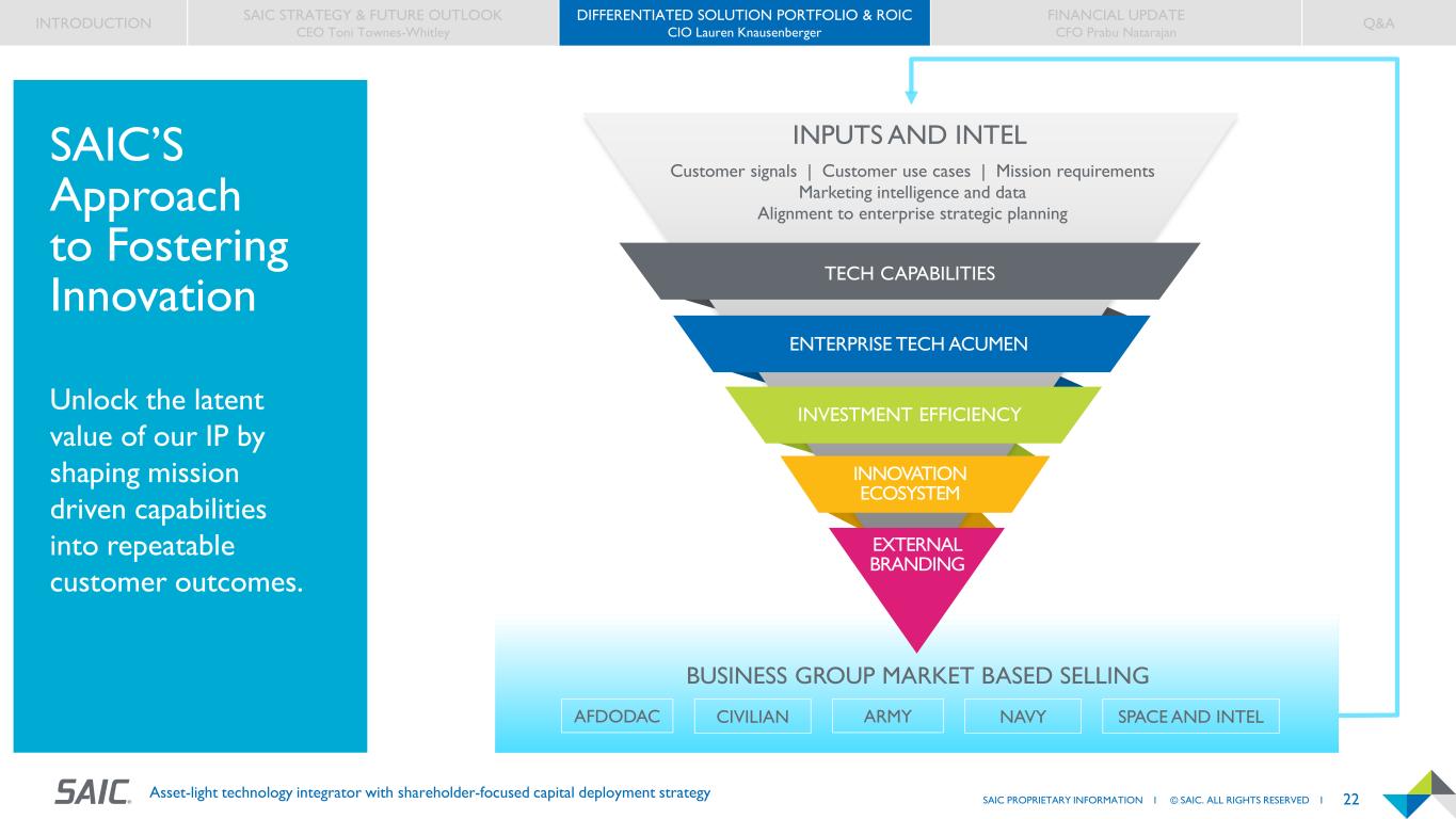 21SAIC PROPRIETARY INFORMATION I © SAIC. ALL RIGHTS RESERVED I Asset-light technology integrator with shareholder-focused capital deployment strategy Differentiated Solutions Portfolio Mission Knowledge Talent Reputation of Trust Past Performance SECURE MULTI-CLOUD OPERATIONAL AI SECURE DATA ANALYTICS DIGITAL ENGINEERING CloudScend Data Science Suite, KDP, Tenjin, AI Advisory ReadyOne Licenses  Fast, scalable migration of systems / apps  Enhanced security via Zero Trust, Trust Resilience  Operates across multiple CSPs and multiple security domains  Infrastructure for rapid deployment and integration across mission systems  Turns mission owners into citizen data scientists  Force multiplier for workforce Fosters trust, adoption, and model explainability  Shared data layer across multiple stakeholders at varied levels of security  Elastic scalability from edge to global exabyte scale  Modular approach for integration into legacy system from the enterprise to the edge  Highly-tailorable, fully-integrated, & rapidly deployable solution  Seamless interoperability of data across the entire engineering lifecycle  Open architecture approach to systems integration Delivery Models SYSTEM OF SYSTEMS INTEGRATION cUAS, Torpedoes, MLRS, Air Crew Trainers  Rapid Integration of hardware, software, data models, and OEM components  Tailored to problem statement; vendor / tech agnostic ON-DEMAND SOLUTION DELIVERY DevSecOps Sprints, DE Jump Packages  On-demand delivery of secure, functioning solutions in days / weeks  Streamlined, agile-friendly acquisition and efficient execution INTRODUCTION SAIC STRATEGY & FUTURE OUTLOOK CEO Toni Townes-Whitley DIFFERENTIATED SOLUTION PORTFOLIO & ROIC CIO Lauren Knausenberger FINANCIAL UPDATE CFO Prabu Natarajan Q&A