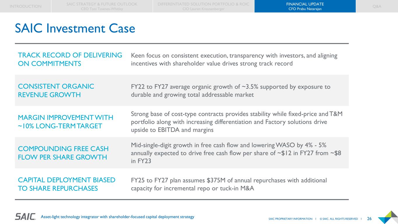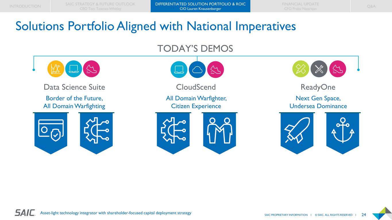 23SAIC PROPRIETARY INFORMATION I © SAIC. ALL RIGHTS RESERVED I Asset-light technology integrator with shareholder-focused capital deployment strategy Key Metrics to Assess Innovation Factory Impact REVENUE ADOPTION IF AFFILIATED REVENUE Total revenue captured on a contract awarded to SAIC because of our differentiated IF offerings IF DISCREET REVENUE Offering-specific revenues captured by SAIC directly attributable to our differentiated IF offerings IF-DRIVEN ON CONTRACT GROWTH Outcome-based revenue captured through sales of differentiated IF offerings into the ceiling of existing contracts TECHNICAL SCORES AND WIN RATES Increase in sales and/or positive IF offering feedback from proposal evaluations IF ALIGNMENT TO BID VOLUME Percentage of total bids that include SAIC’s differentiated IF offerings INTERNAL ADOPTION Extent to which SAIC incorporates our differentiated customer-facing solutions into our own operations INTRODUCTION SAIC STRATEGY & FUTURE OUTLOOK CEO Toni Townes-Whitley DIFFERENTIATED SOLUTION PORTFOLIO & ROIC CIO Lauren Knausenberger FINANCIAL UPDATE CFO Prabu Natarajan Q&A