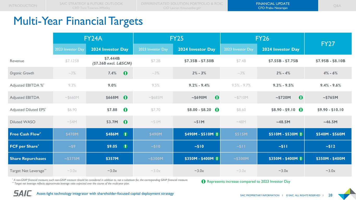 27SAIC PROPRIETARY INFORMATION I © SAIC. ALL RIGHTS RESERVED I Asset-light technology integrator with shareholder-focused capital deployment strategy * A non-GAAP financial measure; such non-GAAP measure should be considered in addition to, not a substitute for, the corresponding GAAP financial measure. ** Target net leverage reflects approximate leverage ratio expected over the course of the multi-year plan. FY24A FY25 FY26 FY27 Revenue $7.444B ($7.26B excl. L&SCM) $7.35B - $7.50B $7.55B - $7.75B $7.95B - $8.10B Organic Growth 7.4% 2% - 3% 2% - 4% 4% - 6% Adjusted EBITDA %* 9.0% 9.2% - 9.4% 9.3% - 9.5% 9.4% - 9.6% Adjusted EBITDA $668M ~$690M ~$720M ~$765M Adjusted Diluted EPS* $7.88 $8.00 - $8.20 $8.90 - $9.10 $9.90 - $10.10 Diluted WASO 53.7M ~51M ~48.5M ~46.5M Free Cash Flow* $486M $490M - $510M $510M - $530M $540M - $560M FCF per Share* $9.05 ~$10 ~$11 ~$12 Share Repurchases $357M $350M - $400M $350M - $400M $350M - $400M Target Net Leverage** ~3.0x ~3.0x ~3.0x ~3.0x Multi-Year Financial Targets INTRODUCTION SAIC STRATEGY & FUTURE OUTLOOK CEO Toni Townes-Whitley DIFFERENTIATED SOLUTION PORTFOLIO & ROIC CIO Lauren Knausenberger FINANCIAL UPDATE CFO Prabu Natarajan Q&A