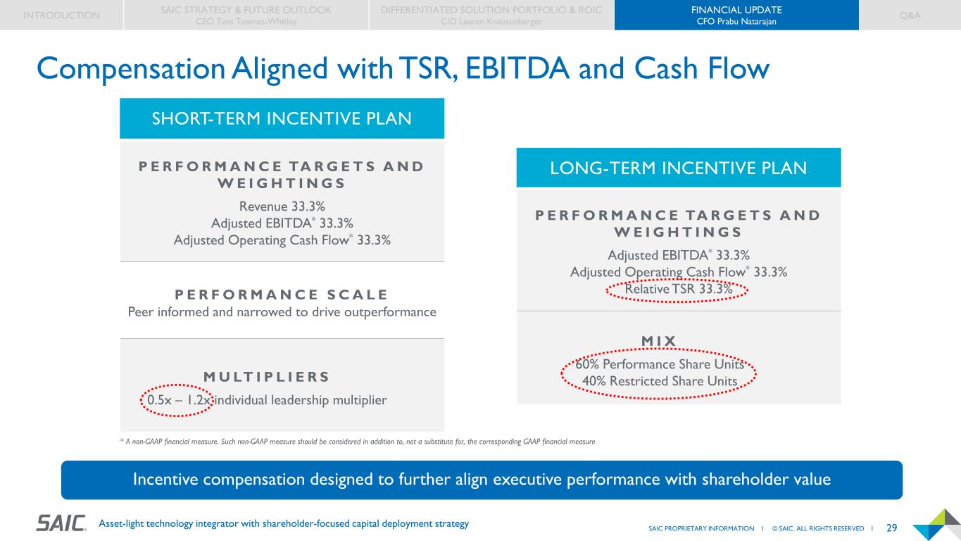 28SAIC PROPRIETARY INFORMATION I © SAIC. ALL RIGHTS RESERVED I Asset-light technology integrator with shareholder-focused capital deployment strategy * A non-GAAP financial measure; such non-GAAP measure should be considered in addition to, not a substitute for, the corresponding GAAP financial measure. ** Target net leverage reflects approximate leverage ratio expected over the course of the multi-year plan. FY24A FY25 FY26 FY27 2023 Investor Day 2024 Investor Day 2023 Investor Day 2024 Investor Day 2023 Investor Day 2024 Investor Day Revenue $7.125B $7.444B ($7.26B excl. L&SCM) $7.2B $7.35B - $7.50B $7.4B $7.55B - $7.75B $7.95B - $8.10B Organic Growth ~3% 7.4% ~3% 2% - 3% ~3% 2% - 4% 4% - 6% Adjusted EBITDA %* 9.3% 9.0% 9.5% 9.2% - 9.4% 9.5% - 9.7% 9.3% - 9.5% 9.4% - 9.6% Adjusted EBITDA ~$660M $668M ~$685M ~$690M ~$710M ~$720M ~$765M Adjusted Diluted EPS* $6.90 $7.88 $7.70 $8.00 - $8.20 $8.60 $8.90 - $9.10 $9.90 - $10.10 Diluted WASO ~54M 53.7M ~51M ~51M ~48M ~48.5M ~46.5M Free Cash Flow* $470M $486M $490M $490M - $510M $515M $510M - $530M $540M - $560M FCF per Share* ~$9 $9.05 ~$10 ~$10 ~$11 ~$11 ~$12 Share Repurchases ~$375M $357M ~$300M $350M - $400M ~$300M $350M - $400M $350M - $400M Target Net Leverage** ~3.0x ~3.0x ~3.0x ~3.0x ~3.0x ~3.0x ~3.0x Multi-Year Financial Targets INTRODUCTION SAIC STRATEGY & FUTURE OUTLOOK CEO Toni Townes-Whitley DIFFERENTIATED SOLUTION PORTFOLIO & ROIC CIO Lauren Knausenberger FINANCIAL UPDATE CFO Prabu Natarajan Q&A Represents increase compared to 2023 Investor Day